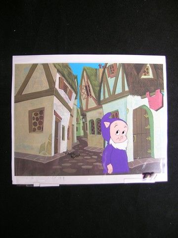 This is a large size, Warner Bros. animation cel of everybody's favorite stuttering pig, Porky Pig. The cel is hand painted and affixed to a glossy painted background scene, and is signed by the late artist Virgil Ross. Virgil Ross' animation career spanned over 60 years and included dozens of cartoon series, such as The Fintstones, Quick Draw McGraw, and the animated Star Trek series, as well as a couple hundred classic Warner Bros./Looney Tunes shorts. (measures approx. 11"x 13 1/2")