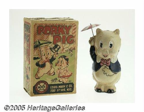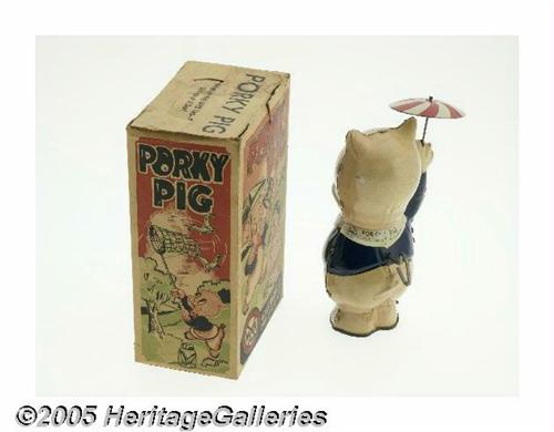 <B>Porky Pig Toy with Umbrella and Box (Marx, 1939).</B></I> This impressive tin litho toy with built-in key is 3"x 5"x 8.5" tall and comes in nicely illustrated box. The front and back panels depict Porky trying to impress Petunia, while another pig is in the background with a lasso. Right and left side panels depict Porky capturing butterflies. All flaps are present, the top flaps are detached. Bottom right of box has a small area of moisture staining. Box still displays nicely, all art remains strong. Porky Pig toy shows some minute scattered paint nicks, but remains totally bright and glossy. Toy still looks Excellent. <I>From the Larry Jacobs Collection.</B></I>