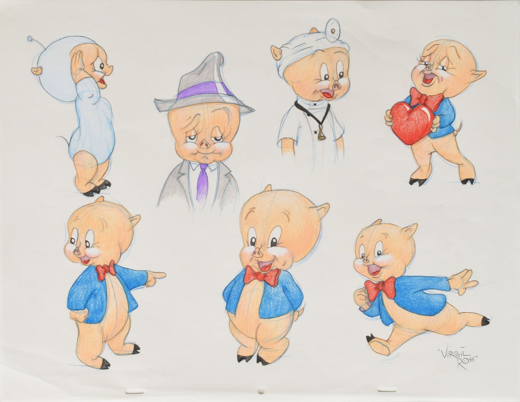 (Warner Brothers Studios, circa 1990s) Original color model drawing by Virgil Ross featuring Porky Pig in seven different poses, signed below in pencil by Ross. Accomplished in graphite and colored pencil on untrimmed 16.5 x 13.5 animation paper, with the total image measuring 14.5 x 11. In fine condition.