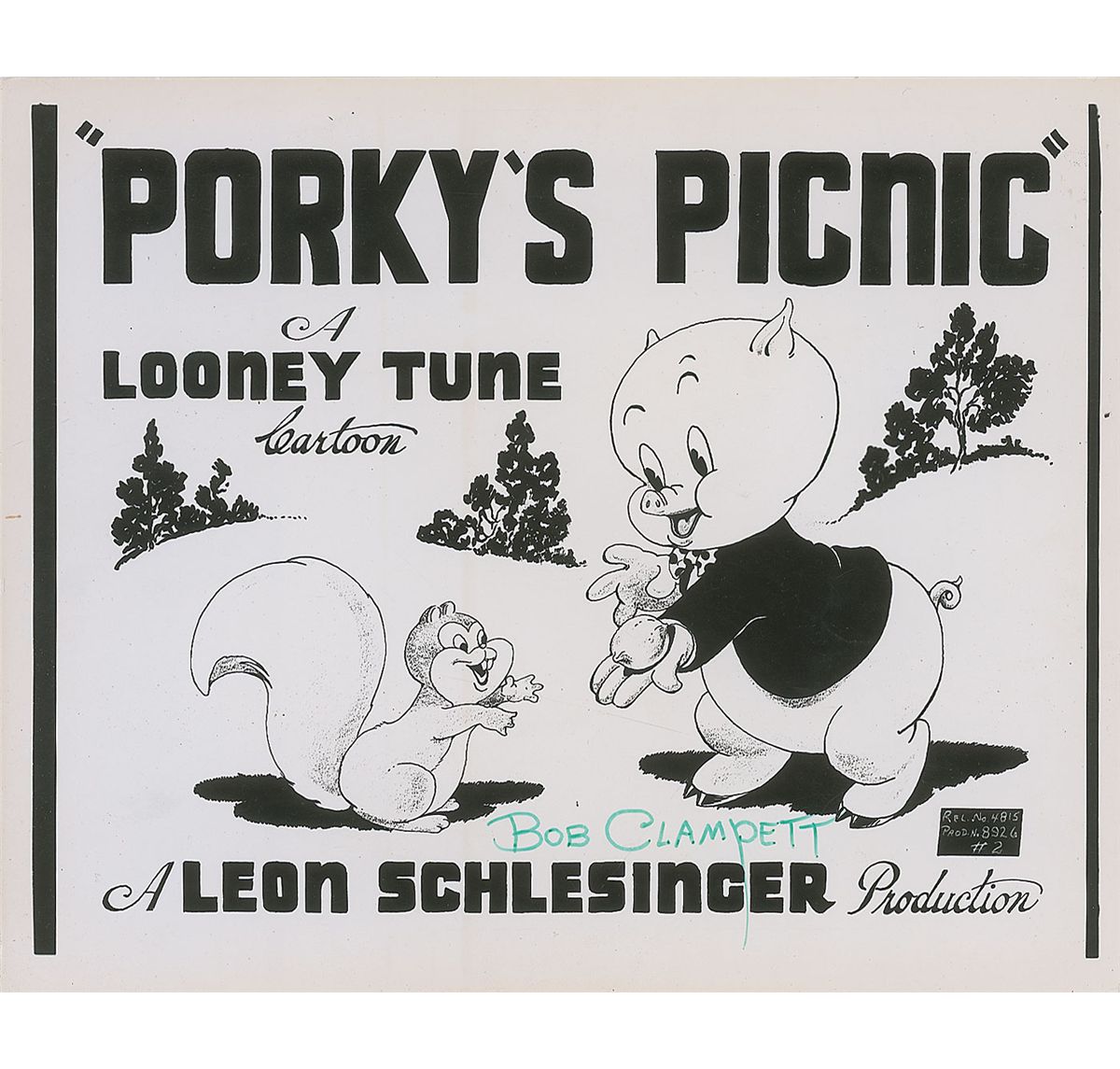 (Warner Brothers Studios, Circa 1950s) Original glossy 10 x 8 studio for the Porky Pig short entitled Porky’s Picnic, signed in green felt tip by Bob Clampett. In fine condition.