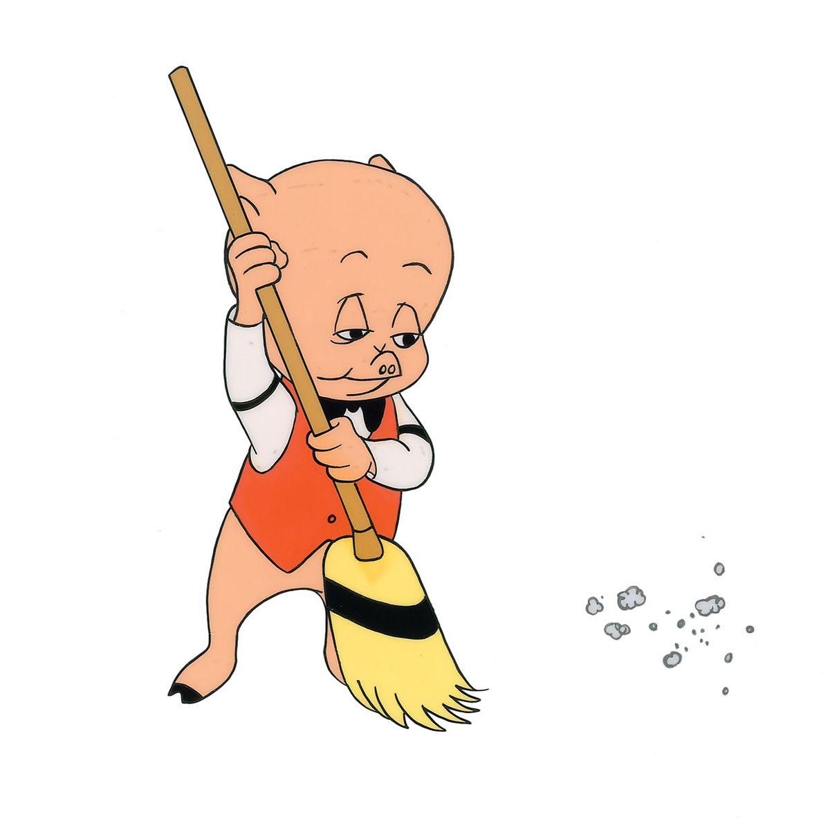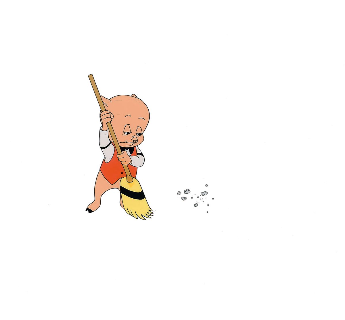 (Warner Brothers Studios, Circa 1960s) Original production cel featuring Porky Pig from a 1960s television cartoon. Full-length image of Porky Pig sweeping measures 5 x 5, with overall dimensions of 12.5 x 10.5. In fine condition, with a few areas of paint stuck to the plain white backing.