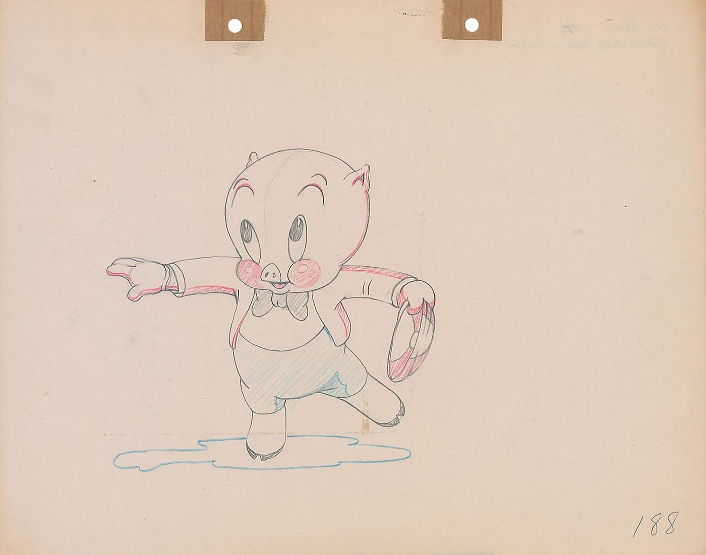 (Warner Brothers Studios, 1939) Original production drawing featuring Porky Pig from Old Glory, showing him dancing and holding his hat in his left hand. Accomplished in colored pencil and graphite on untrimmed 12 x 9.5 animation paper, marked "188" in the lower corner. Image measures 6 x 5.5. In fine condition. Early Warner Bros. production art is quite rare as a fire ravaged the studios in 1934.