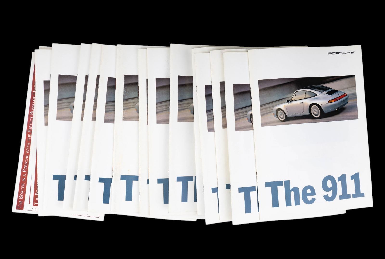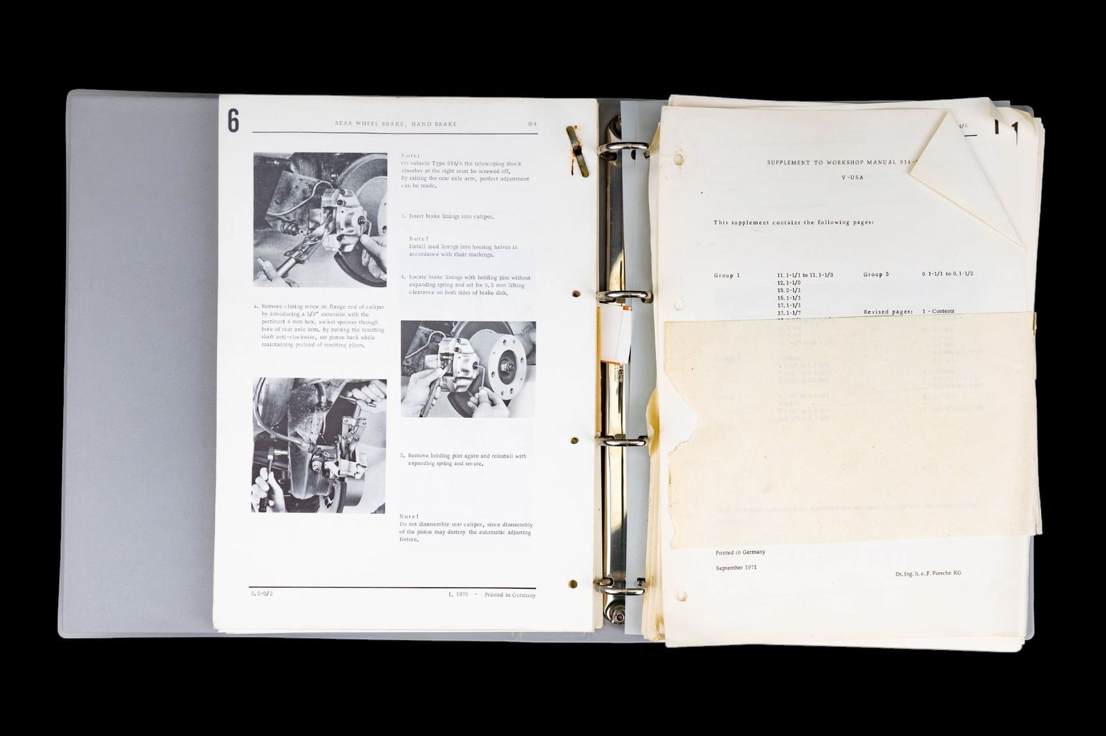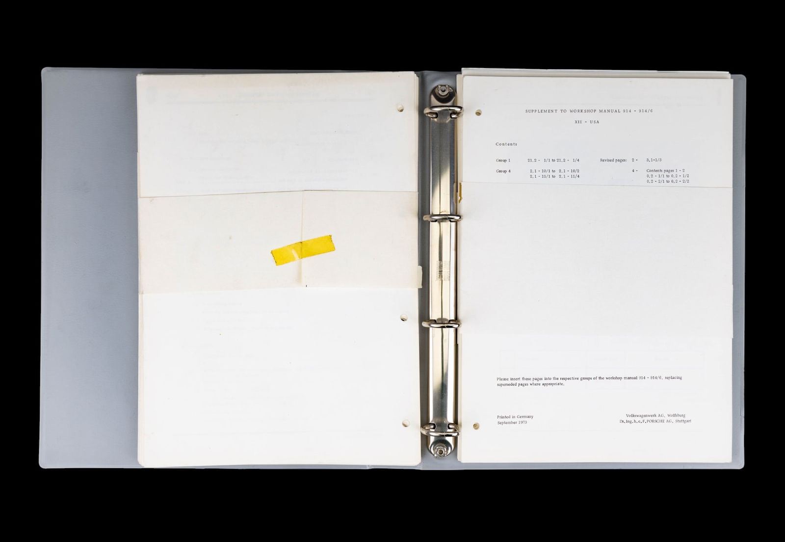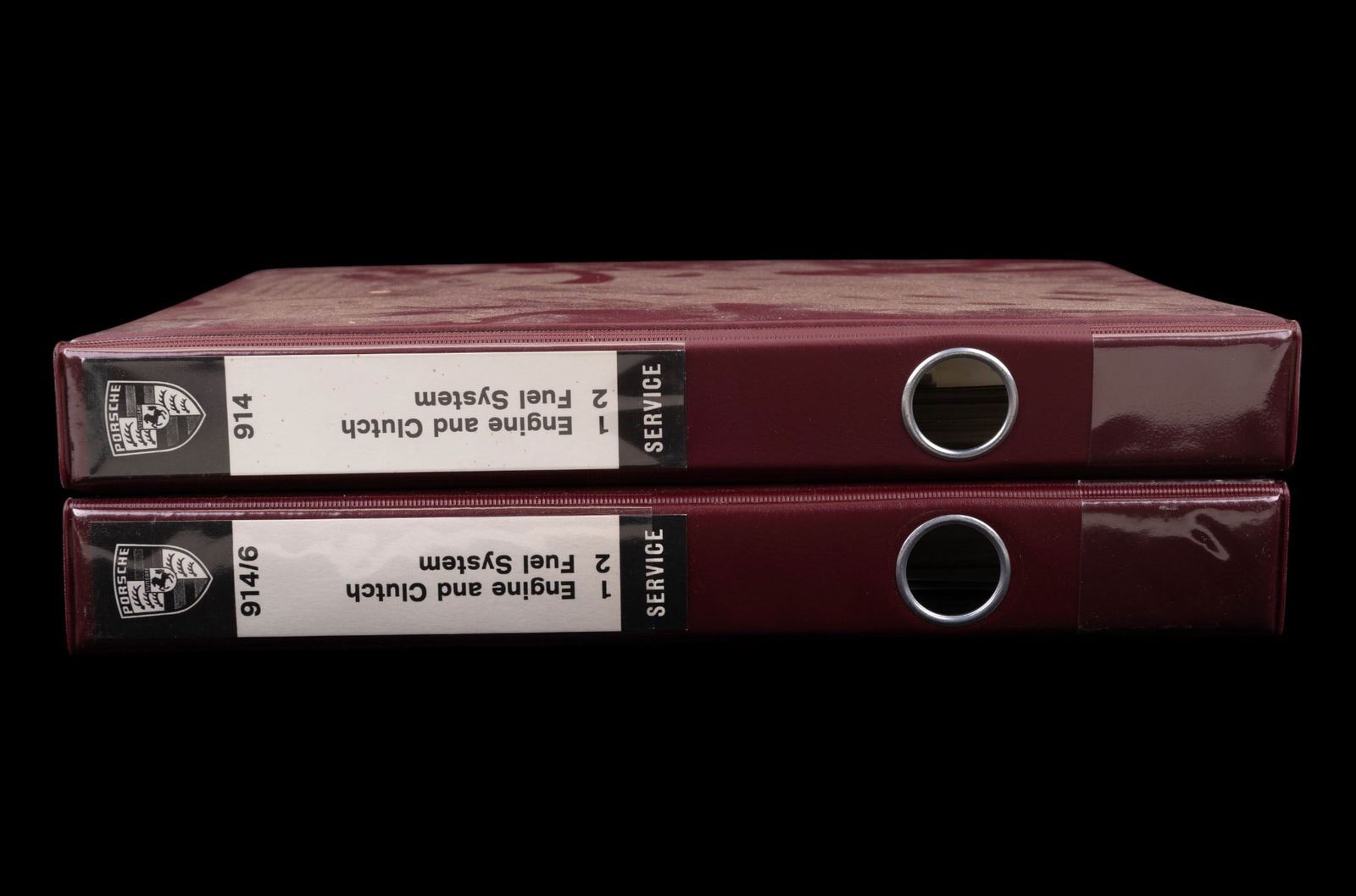 Two Porsche 914 and 914/6 manuals for Engine and Clutch and Fuel System, official Volkswagen printings from 1972 and 1973, and 911 brochures from 1995.