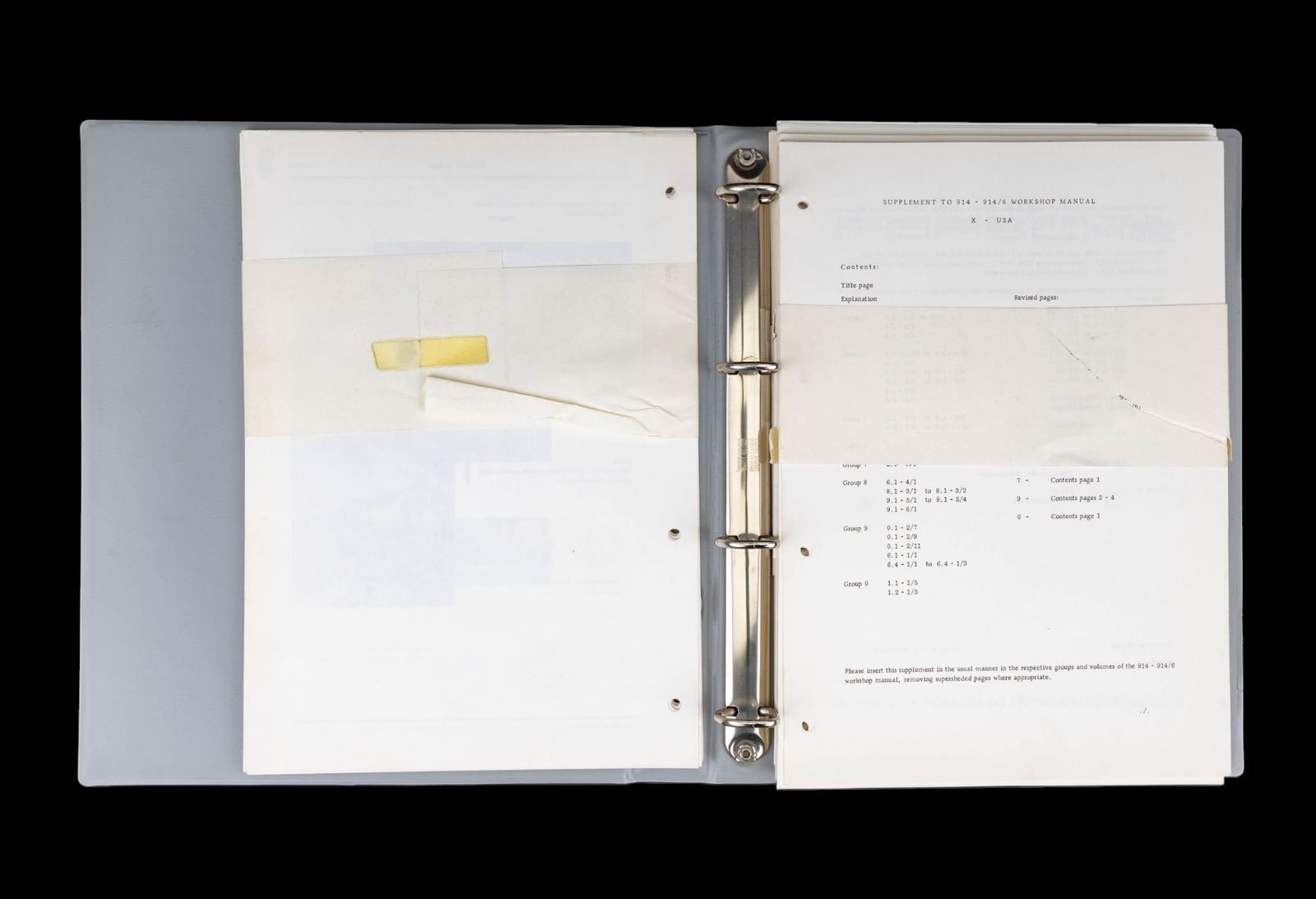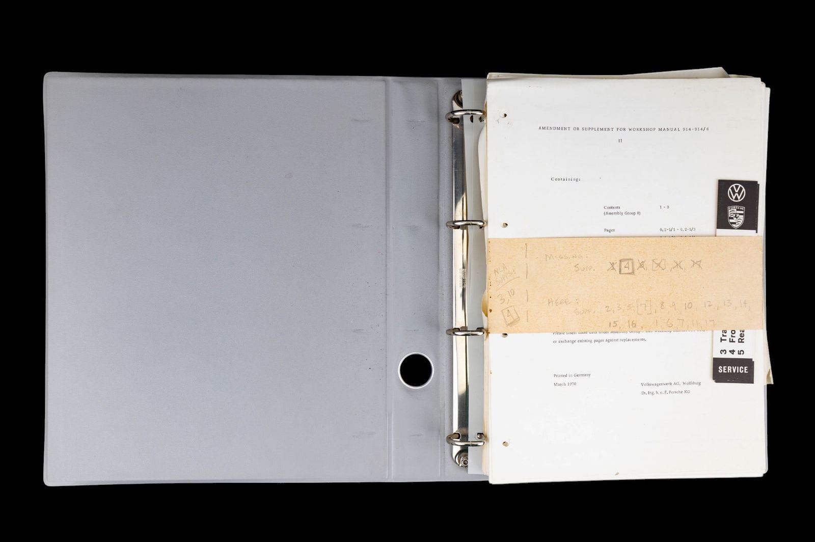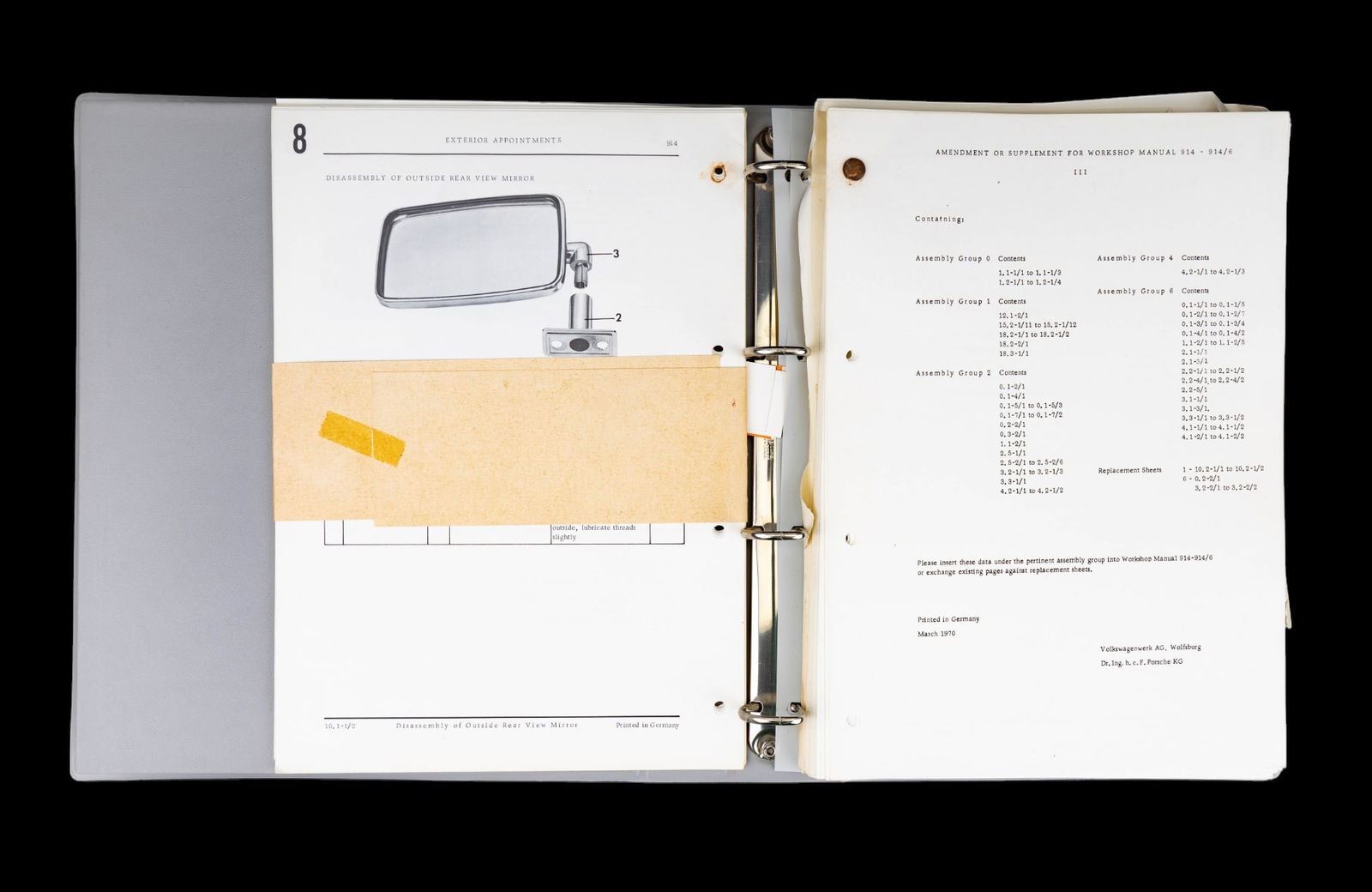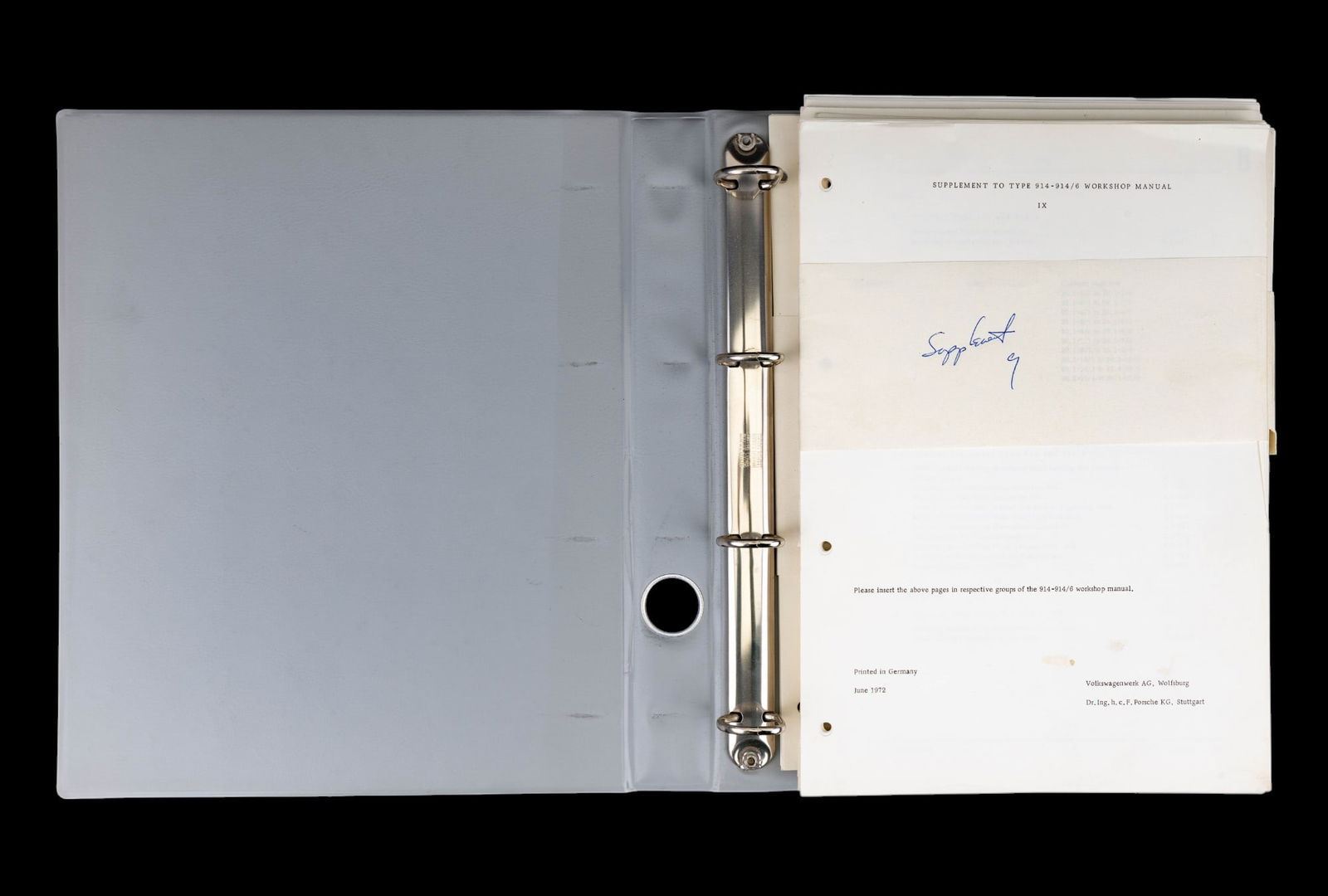 Two Porsche 914 and 914/6 manuals for Engine and Clutch and Fuel System, official Volkswagen printings from 1972 and 1973, and 911 brochures from 1995.