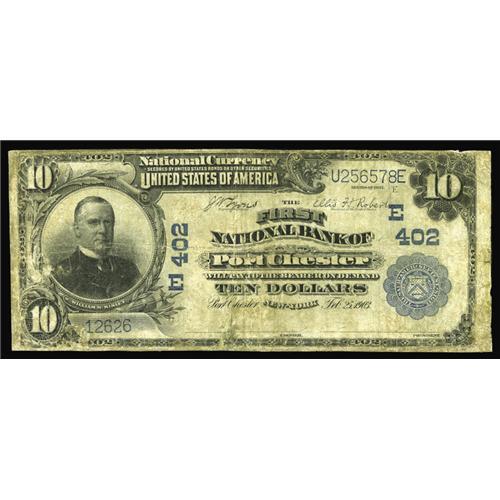 <B>Port Chester, NY</B></I> - $10 1902 Plain Back Fr. 624 <B>The First NB</B></I> Ch. # (E)402<BR>This is the only $10 1902 Plain Back in the census. The signatures have faded away. <B>Very Good.</B></I>