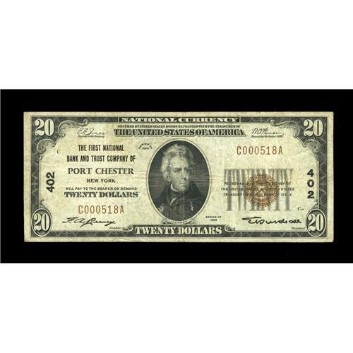 <B>Port Chester, NY</B></I> - $20 1929 Ty. 1 <B>The First NB & TC </B></I> Ch. # 402<BR>This <B>Fine</B></I> note from stongly collected Westchester County bears the second of the two titles under which this bank issued. A couple of tiny abrasions on the portrait are mentioned for the sake of accuracy, although they are quite unobtrusive.