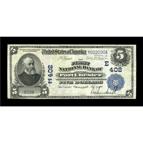<B>Port Chester, NY</B></I> - $5 1902 Date Back Fr. 590 <B>The First NB </B></I> Ch. # (E)402<BR>This example, which may have been wet at one time, has excellent pen signatures visible with a couple pinholes noticed. <B>Fine+.</B></I>