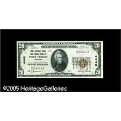 <B>Port Huron, MI</B></I> - $20 1929 Ty. 1 <B>The First National Trust and Savings Bank</B></I> Ch. # 4446<BR>We sold a Gem of this same type and denomination from here in our September 2004 Long Beach auction for $575 and a Choice example a few months earlier at our CSNS Milwaukee sale for $322. This <B>Choice Crisp Uncirculated</B></I> note has pack fresh and fully embossed paper surfaces, but just a tad too many scattered handling marks for a higher grade. Lot:16902
