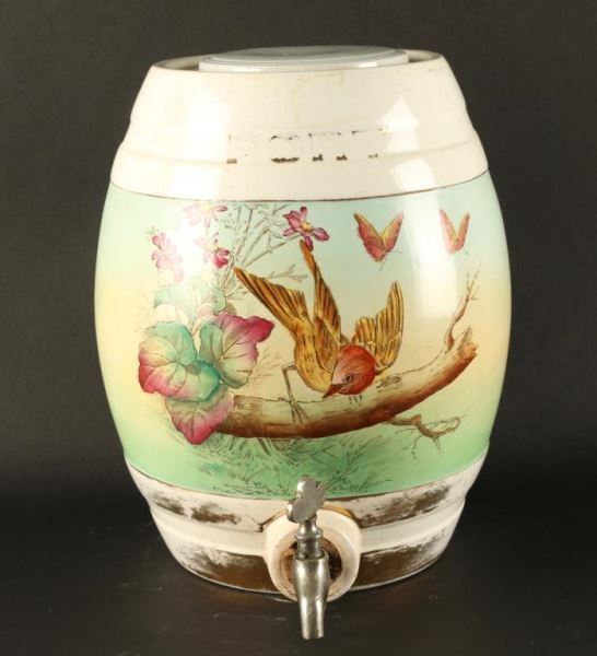 English Mid 19th Century. White ceramic barrel with "Port" and trim in gilt. Scenic colored painting of a bird on a limb with flowers and butterflies. Lettering and gold paint is wearing away in areas, otherwise good. Includes ceramic lid and brass spigot. Measures 11"h x 7"dia.