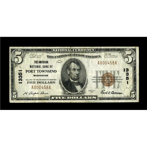 <B>Port Townsend, WA</B></I> - $5 1929 Ty. 1 <B>The American NB</B></I> Ch. # 13351<BR>A very scarce note bearing the first title used here. Just four examples make up the entire census from this bank bearing this nomenclature, with this the sole $5 example. <B>Very Fine.</B></I><BR><BR><b>Shipping:</b> Coin/Currency (<a target="_blank" href="http://www.heritageauctions.com/common/shipping.php">view shipping information</a>)
