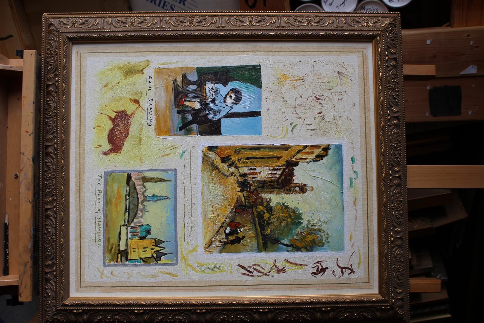 Olga Roubin delightfully captures the essence of early European life with a compilation of images, such as a young child at a school desk, an animal cave painting, and strolling upper-class residents on a busy city street. The oil on canvas measures 24 x