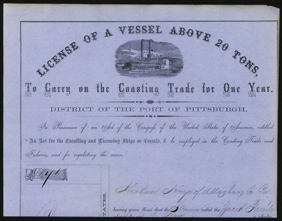 Pittsburgh, Pennsylvania, 1860, Congressional license for carrying on coasting trade (domestic trade only) for one year, attractive steamboat vignette on blue paper, A U.S. Government authorized License, VF condition.