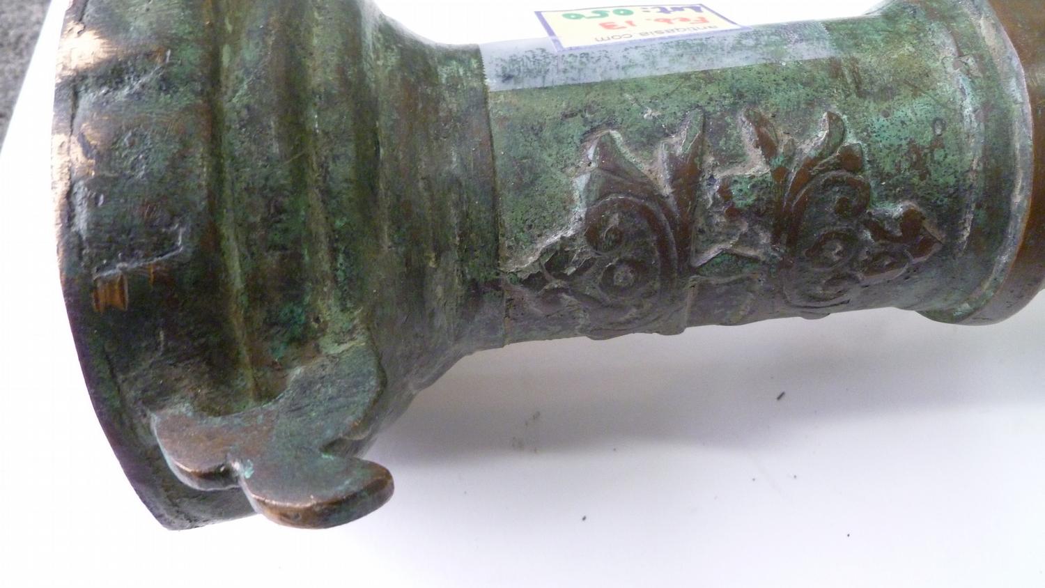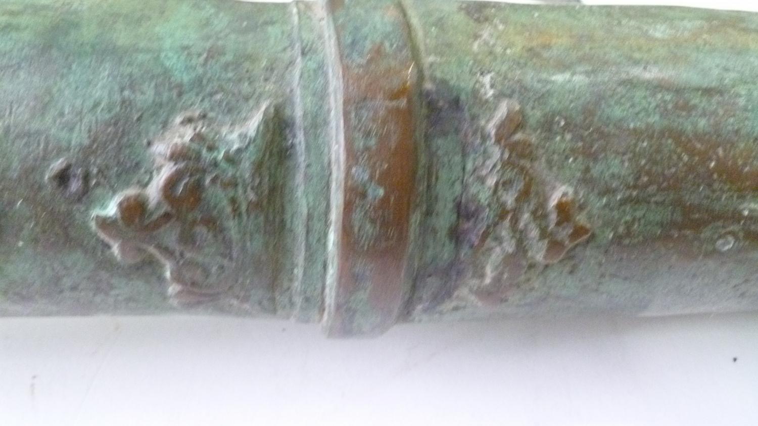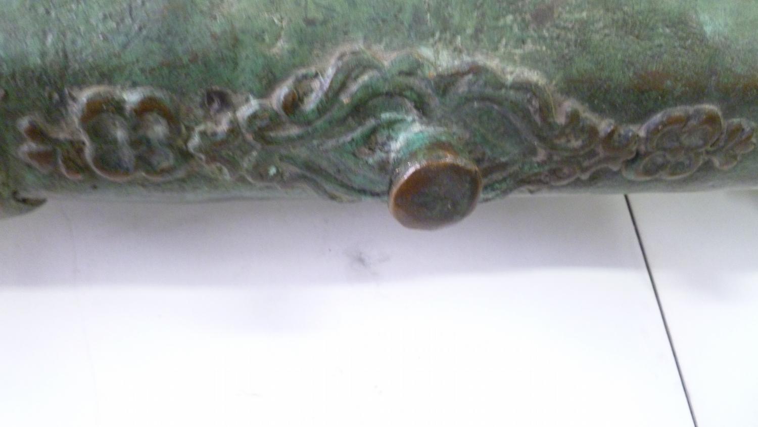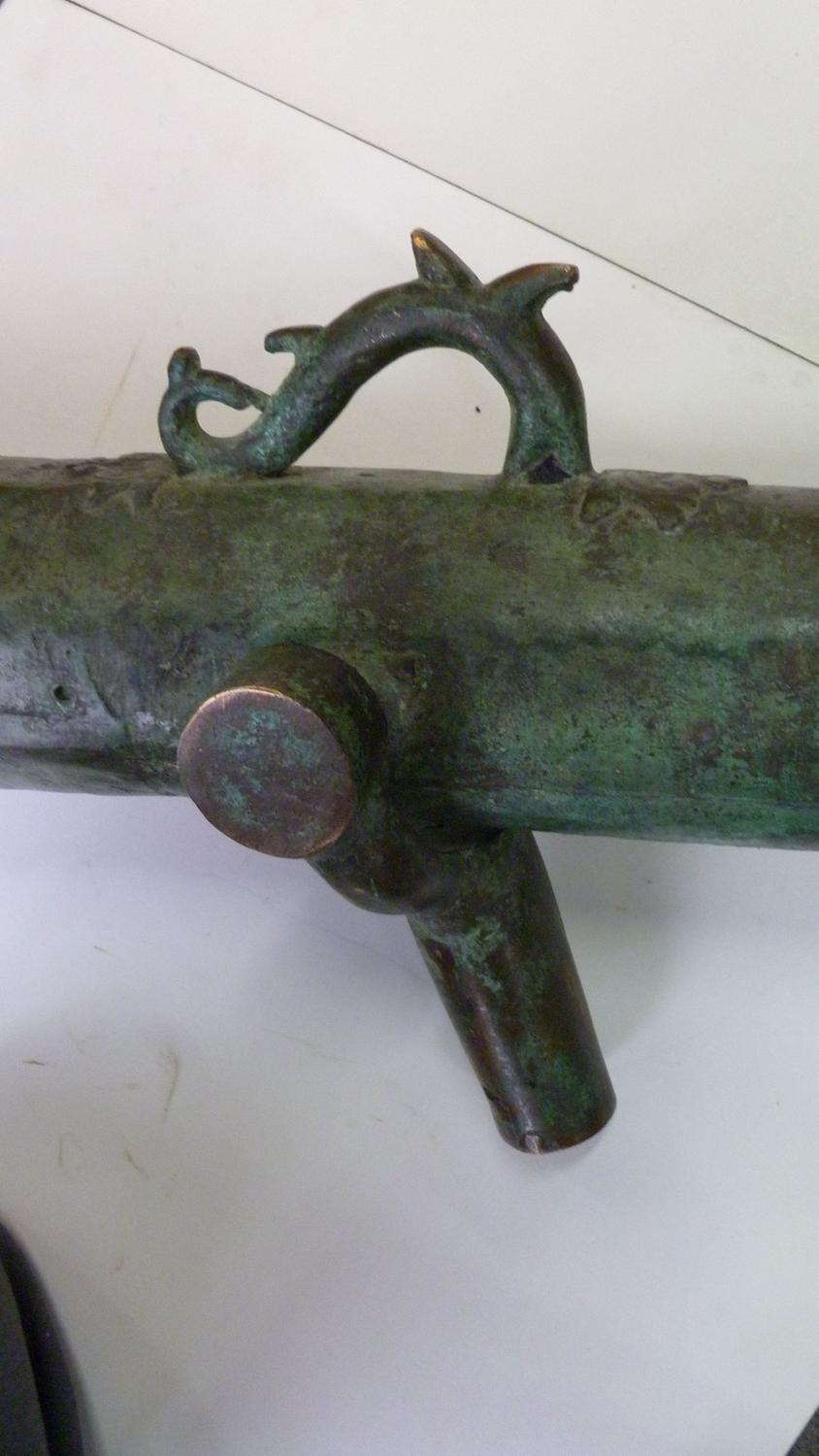 Used on ship as defense against Pirates, these Lantaka (as they are known) are Swivel-Cannons that can be moved around the ship and used in whatever direction the threat is coming from. This rare example was made in the Philippines by the tribal Maranao peoples in their long-obsloete factory in Marawi City, Lanao del Norte (where the Lantaka Museum showed this history until it burned down about 1996). 16-18th C. it has a Naga Sea-Dragon on top as its emblem and handle, and was used in the Sulawesi Sea on a medium-sized trading vessel until it blew-up from over-stuffing the barrel with the typical small stones, nails and anything they could get their hands on. (NOTE: This was a common occurance with these small-bore cannons when high-quality gunpowder was clandestinely acquired from the Dutch or Portuguese, who had no love for the Spanish who controlled the Philippines). Expertly repaired and put back into service at the time (a nice feature of authentication) this Lantaka has developed a fine bronze patina over the several centuries since use. A small example is shown in the UCLA catalog on page 167, with a minimal amount of information about them. A rare and important historical object....and a fine "looker" for a den or office. 55" long (about 140 cms) and weighing about 50 pounds.