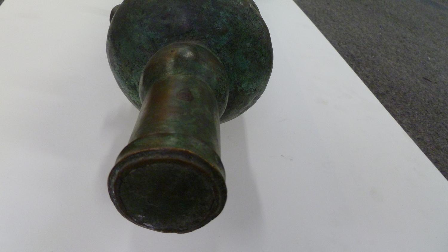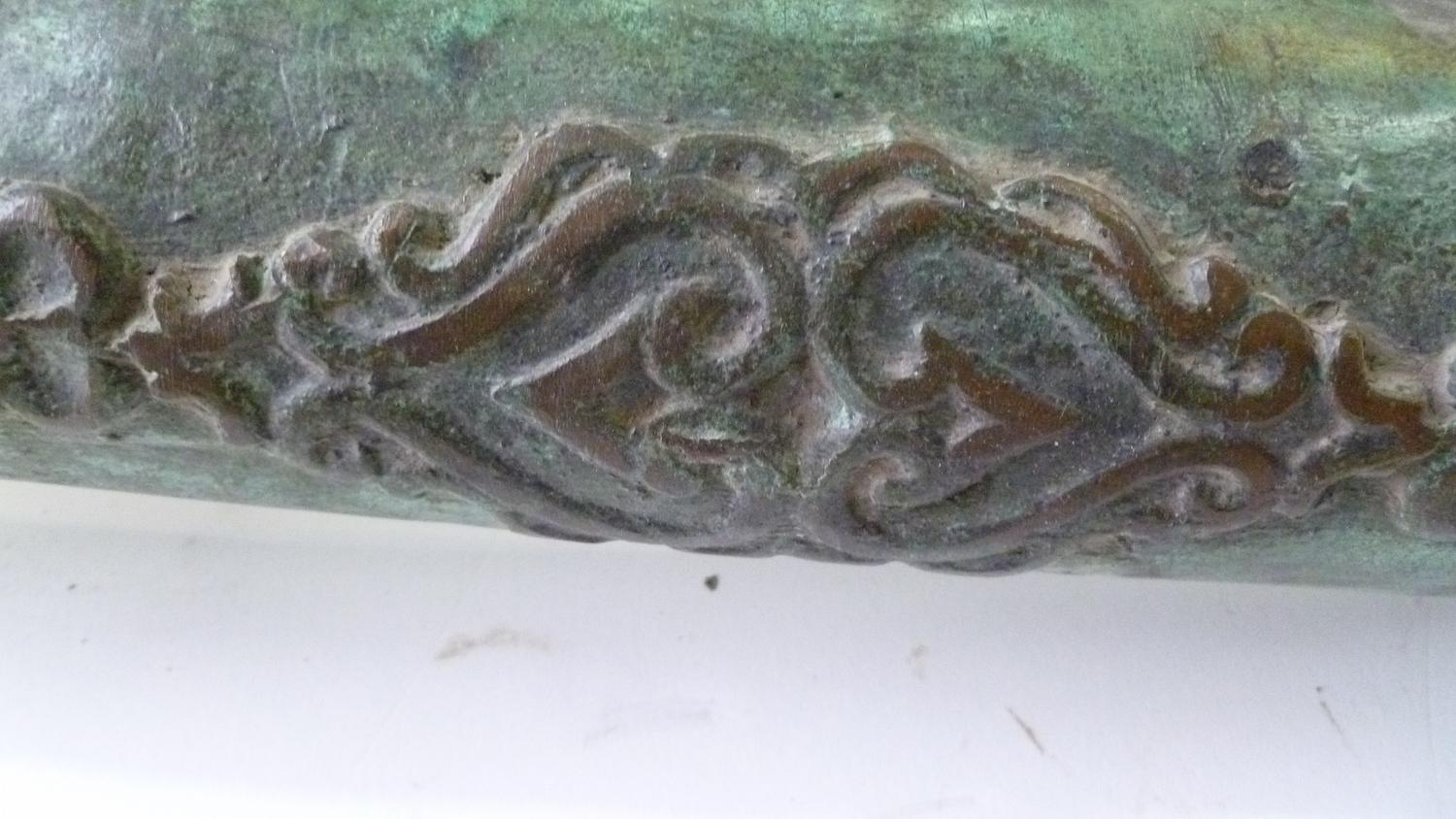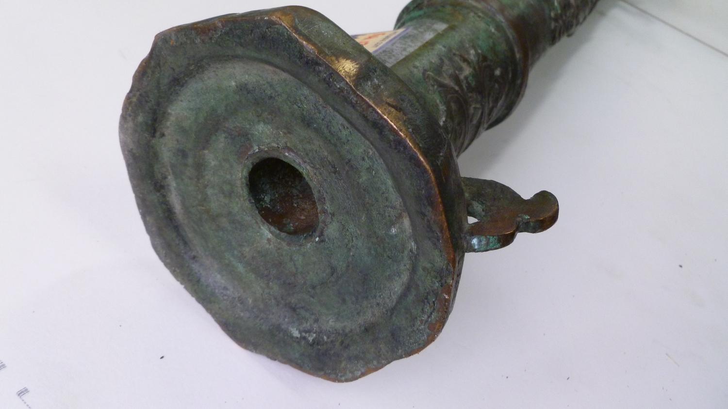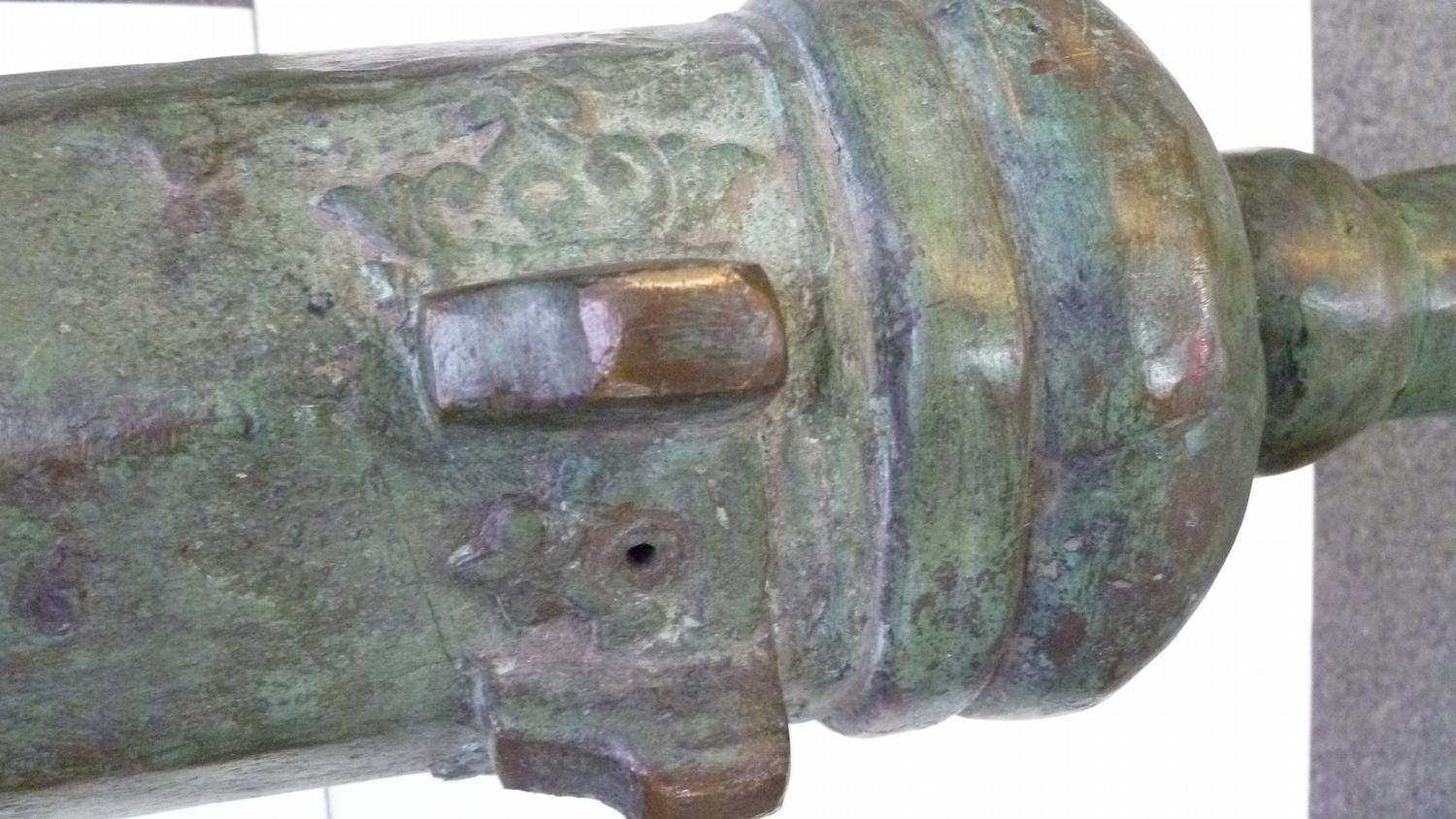 Used on ship as defense against Pirates, these Lantaka (as they are known) are Swivel-Cannons that can be moved around the ship and used in whatever direction the threat is coming from. This rare example was made in the Philippines by the tribal Maranao peoples in their long-obsloete factory in Marawi City, Lanao del Norte (where the Lantaka Museum showed this history until it burned down about 1996). 16-18th C. it has a Naga Sea-Dragon on top as its emblem and handle, and was used in the Sulawesi Sea on a medium-sized trading vessel until it blew-up from over-stuffing the barrel with the typical small stones, nails and anything they could get their hands on. (NOTE: This was a common occurance with these small-bore cannons when high-quality gunpowder was clandestinely acquired from the Dutch or Portuguese, who had no love for the Spanish who controlled the Philippines). Expertly repaired and put back into service at the time (a nice feature of authentication) this Lantaka has developed a fine bronze patina over the several centuries since use. A small example is shown in the UCLA catalog on page 167, with a minimal amount of information about them. A rare and important historical object....and a fine "looker" for a den or office. 55" long (about 140 cms) and weighing about 50 pounds.