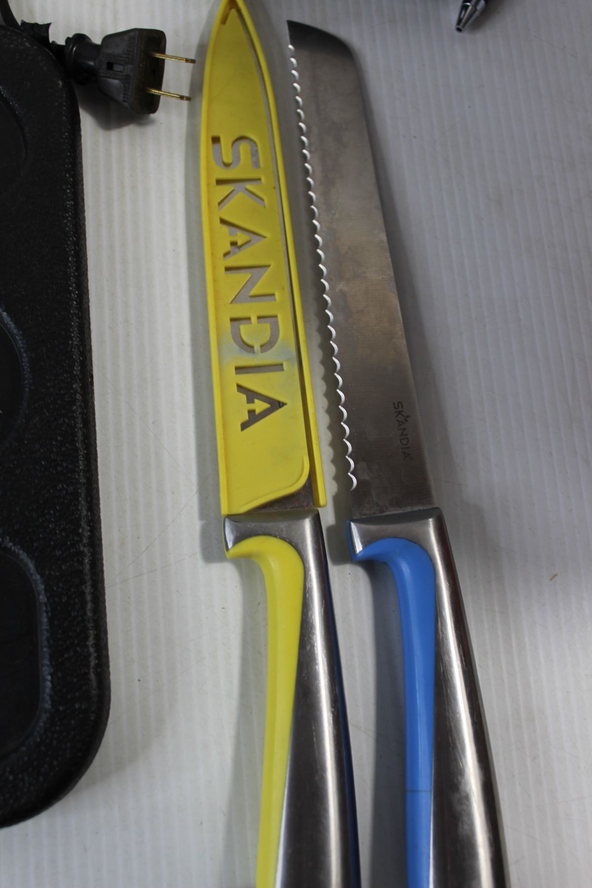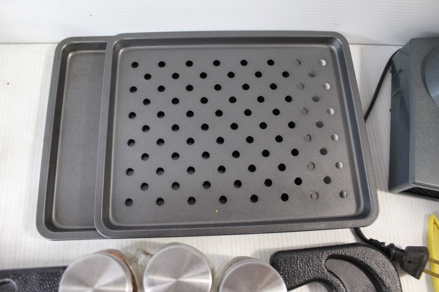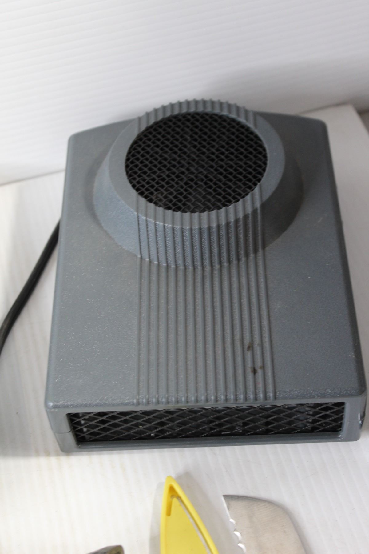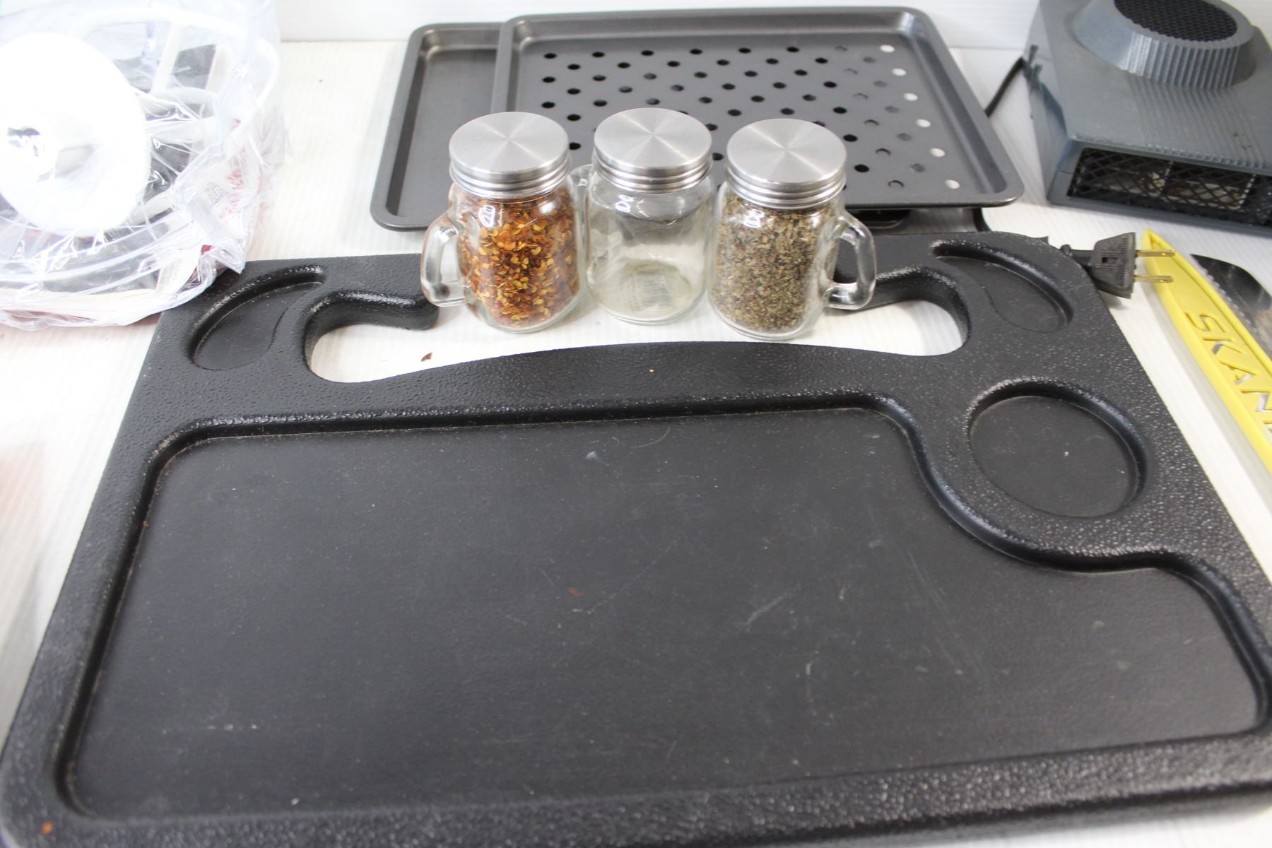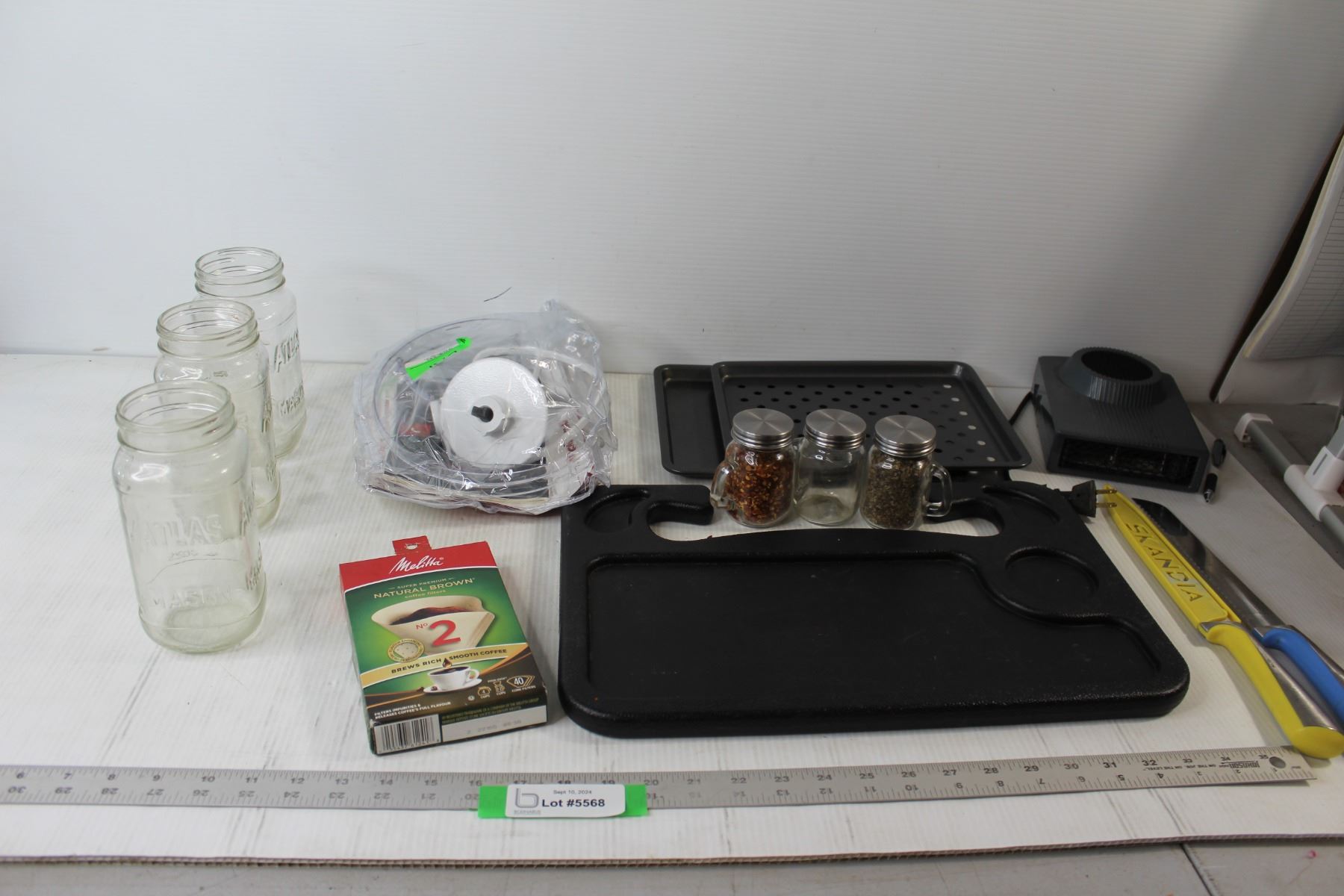 Portable Heater - Tested Works, (3) Spice Jars, (3) Atlas Mason Jars, Coffee Filters, Steering Wheel Tray, (2) Skandia Kitchen Knives, (2) Trays, KitchenAid Mixer parts