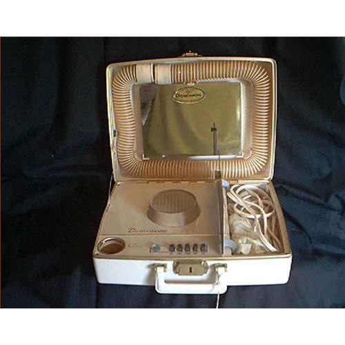 Hair and Nail Dryer is the portable luggage type in the original case and box. This portable hair dryer is marked Model 1805 Luggage Style Hair Dryer Dominion Electric Corp. Mansfield, OH. The hair dryer case has a mirror and it also comes with the soft bonnet for drying and does work and is in fine condition. Ca.1960