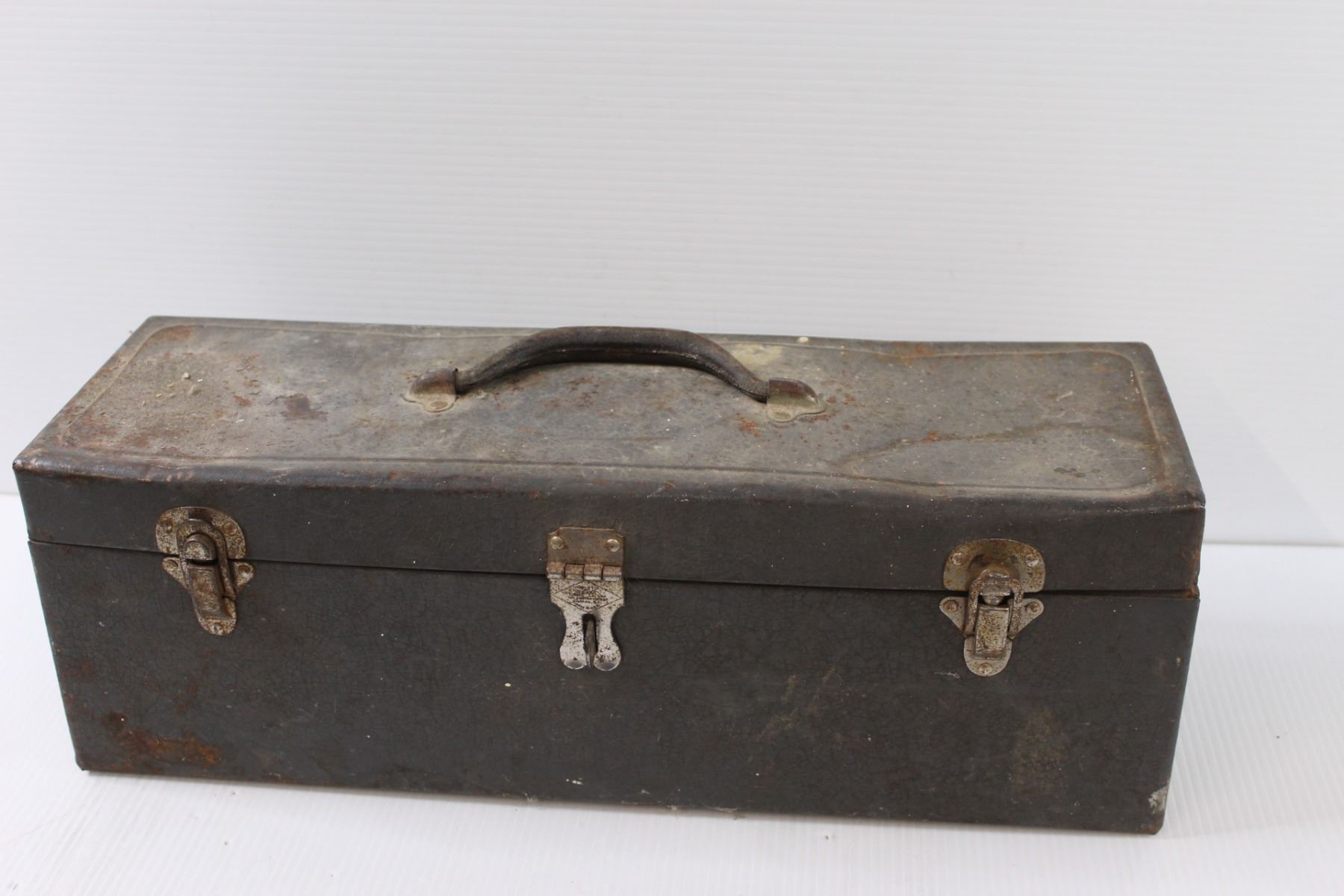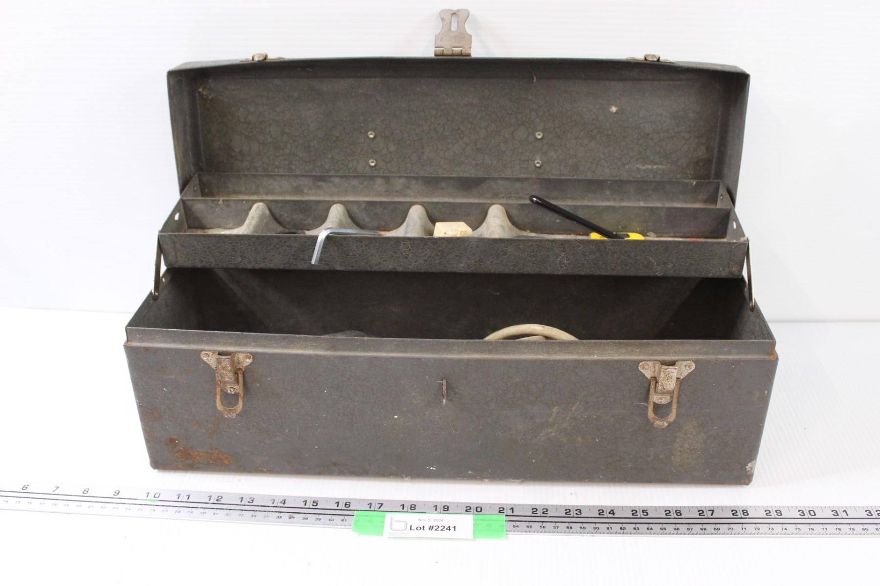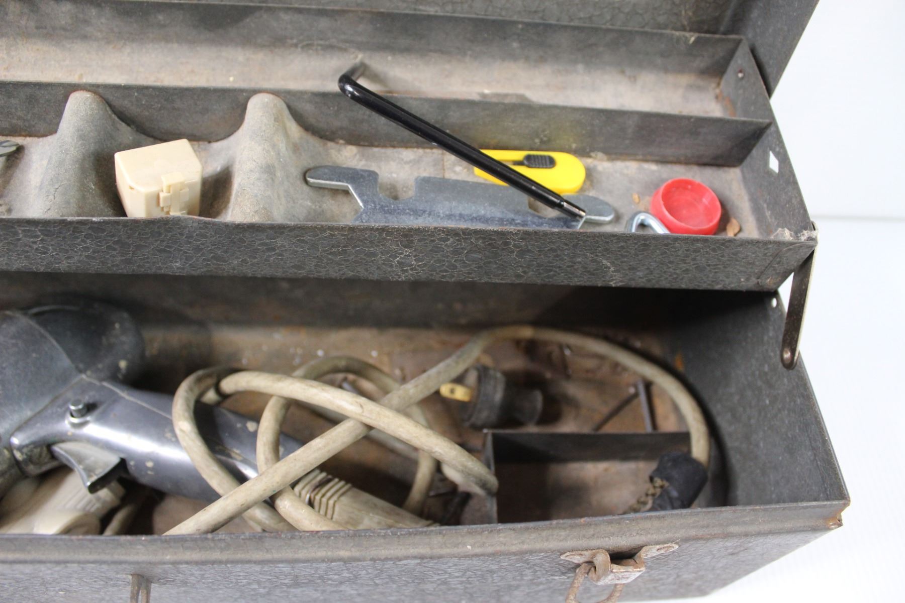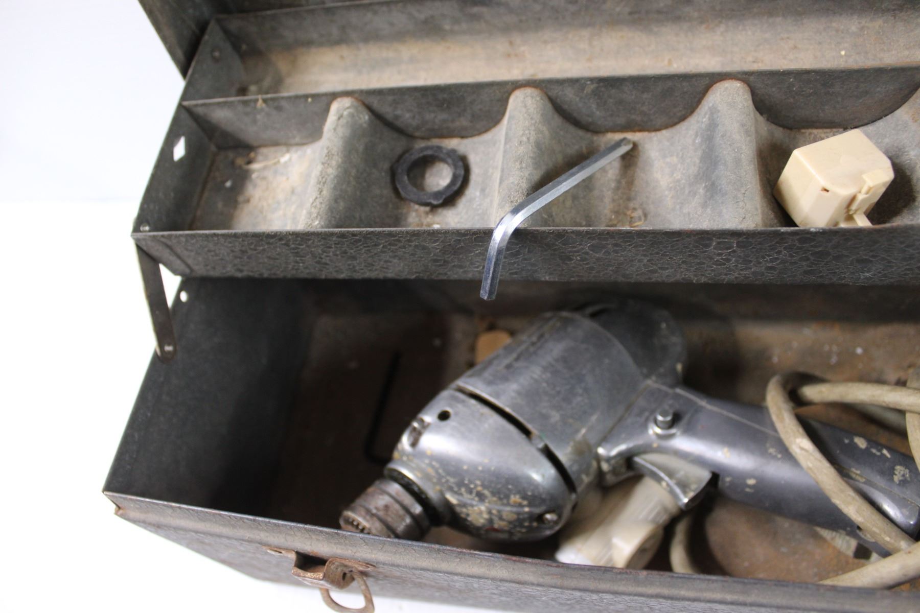 Portable Metal Tool Box w/ Vintage Electric Drill, & Contents