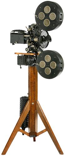 "Ica-Monopol II", um 1920 Ica A.G., Dresden. Demontierbares Wanderkino für 35-mm-Film auf 300-m-Spulen (zwei Spulen in den Original-Feuerschutztrommeln), Objektiv Ica AG 75 mm. Antrieb durch Motor oder Handkurbel (ergänzt). Im Lampenhaus Kohlebogenleuchte mit Kondensor. Malteserkreuzschaltwerk für Bildtransport, selbst öffnende Vorderblende mit Ica-Zeichen. Montiert auf Original-Ica-Transportsäule aus Holz. Vorwiderstand an Säule. Ohne Kabel. Motor, Regulierwiderstand und Kohlebogenlampe funktionieren. - Selten in so gutem Zustand angeboten!