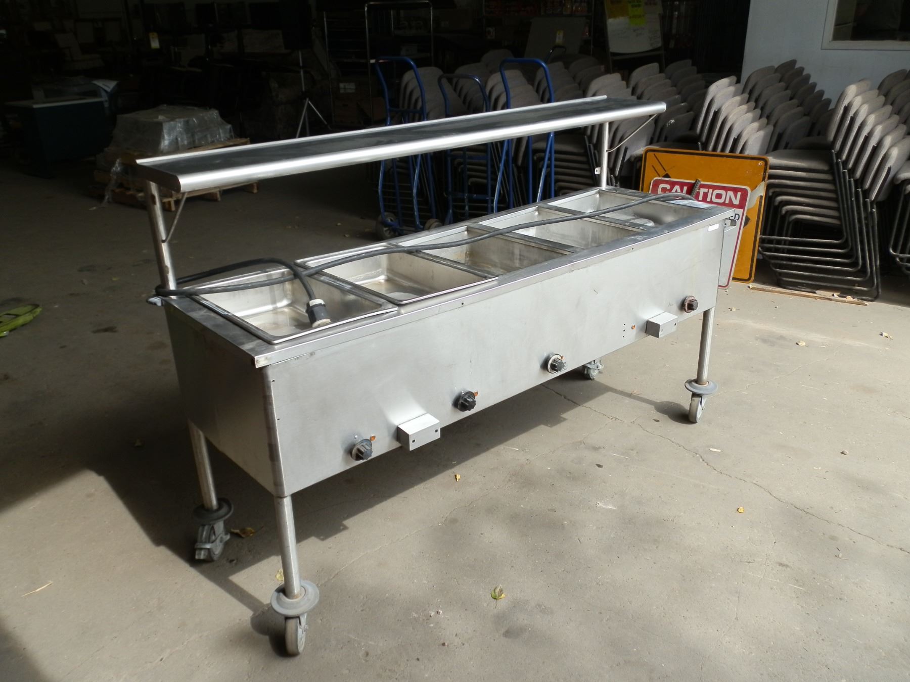 Portable Steam Table, on wheels, this table has 5 bays, runs off of a 220 plug, in good working condition, 74 1/2"L 24 1/2"W 4 foot H...used