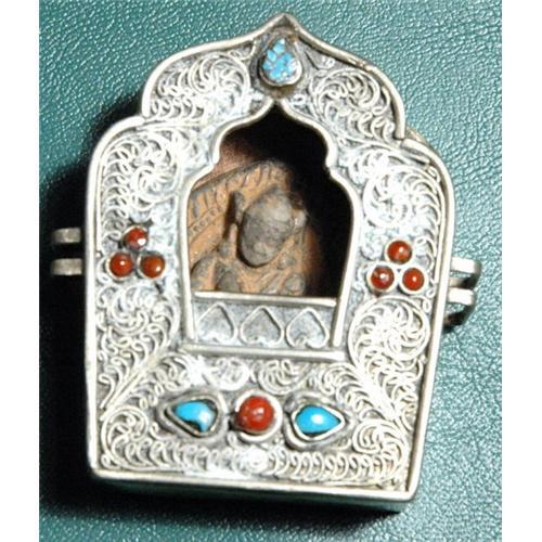 2" high portable Tibetan Buddhist Shrine. Looking out of the window is a Buddha. The bronze based shrine is adorned with silver filigree with turquoise colored and red coral colored stones. There are loops on either side so it can be attached to a belt or chain to be worn around the neck. The back can be removed. The Buddha is of carved stone and moves around freely. It looks as if it was attached but has come unglued There is some additional room for other offerings to be place inside. <p> The condition is good. I do not know the age. The Buddha can easily be re-attached to the back wall of the box if that is what is desired. The condition is good. There some area were the silver has worn down to reveal the bronze base. There is tarnish here and there. Then I have already mention the Buddha that is no longer attached.