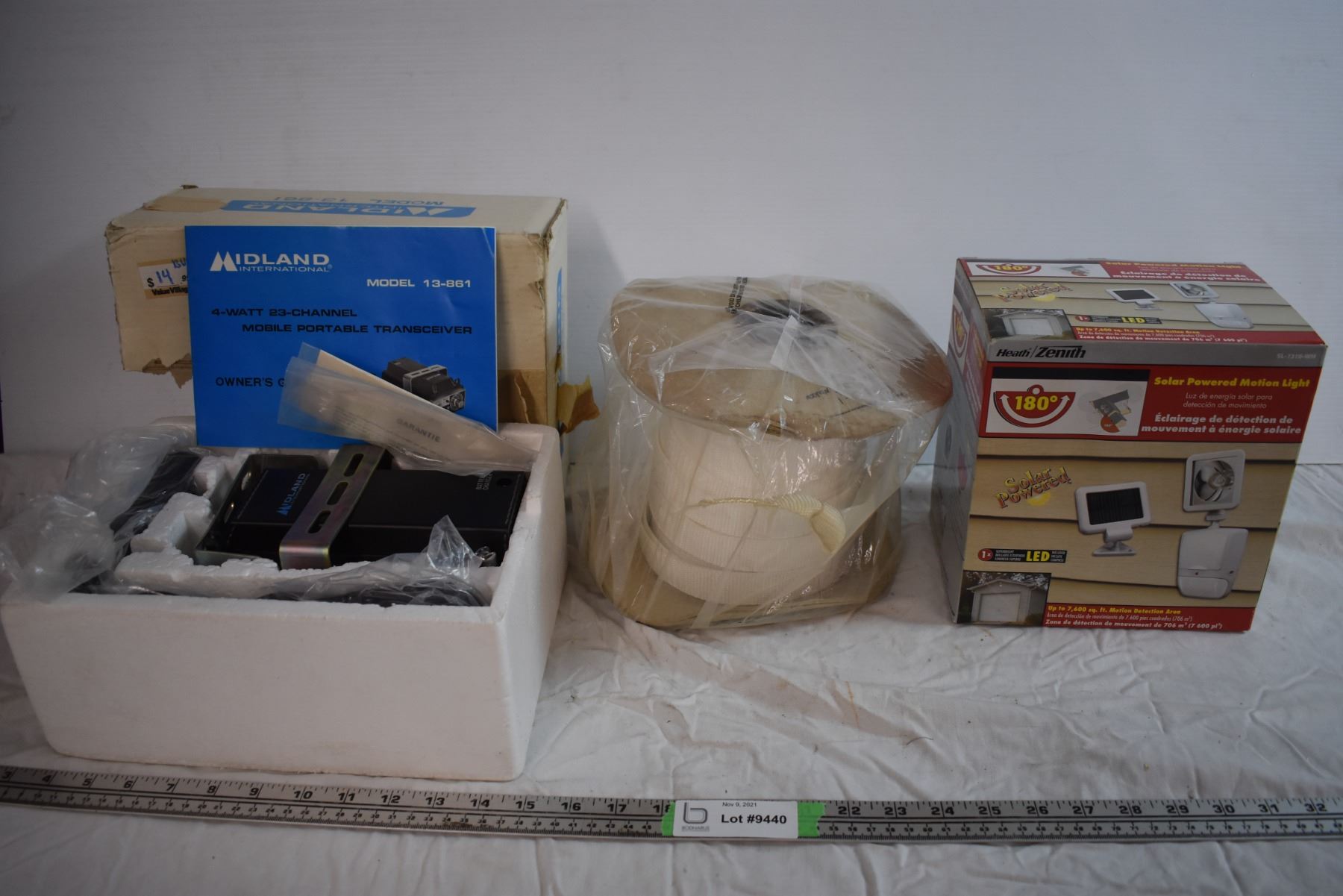 Portable Transceiver, Solar Powered Light, and Spool of Nylon