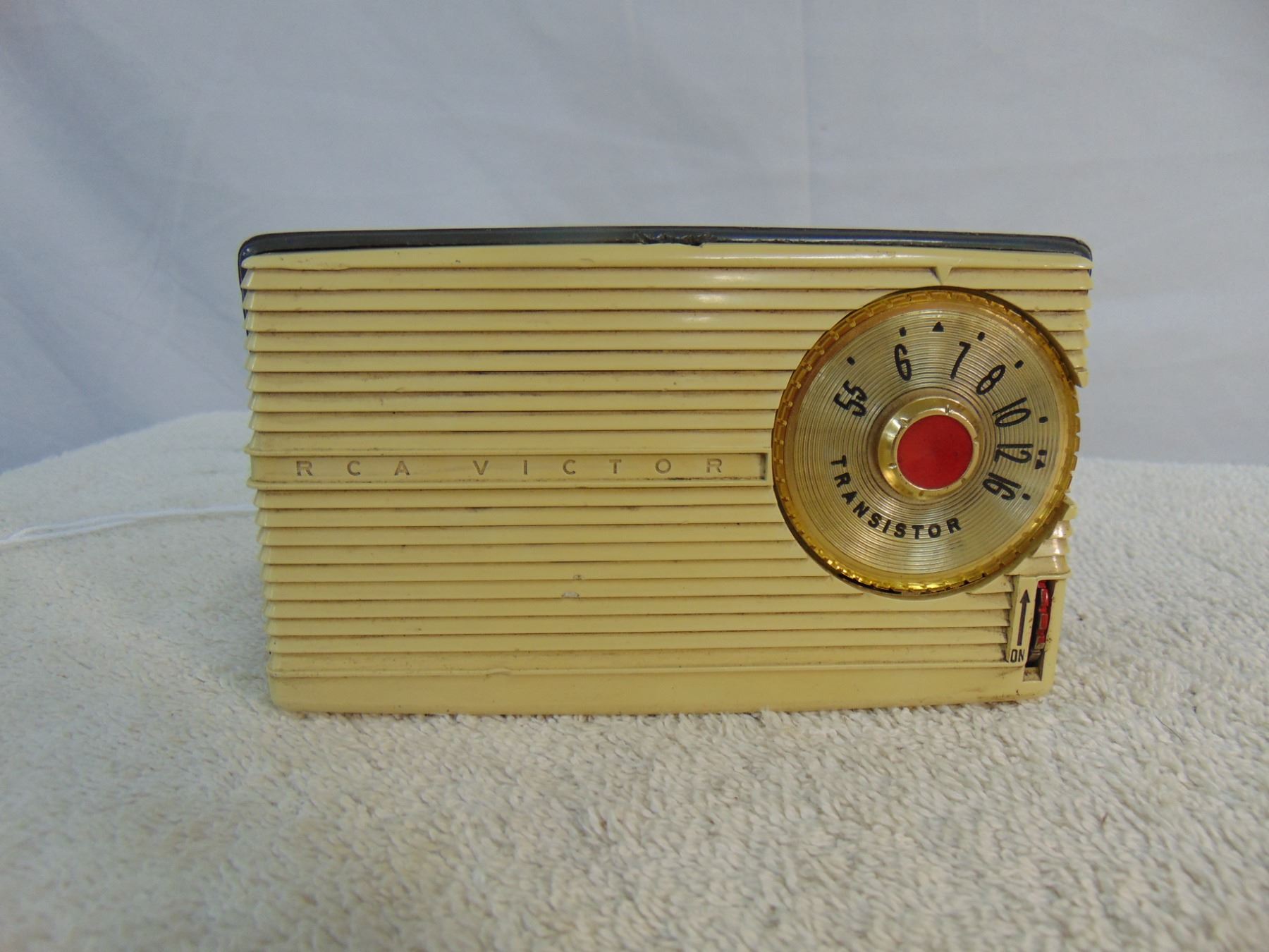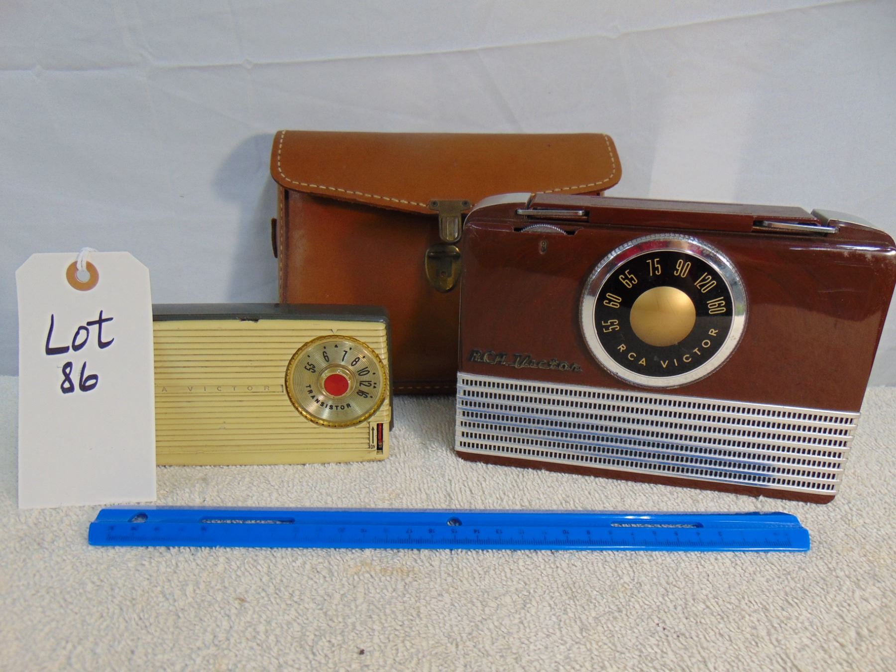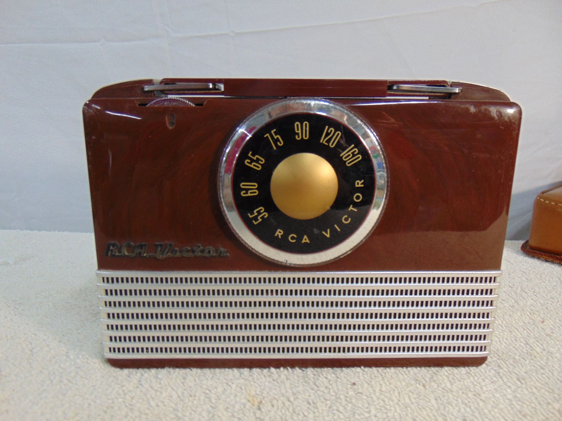 Two items: 1) RCA Victor tube portable, model B-411, includes rare leather carrying case, very nice; 2) RCA, early, model 8-BT-8JE, nice condition