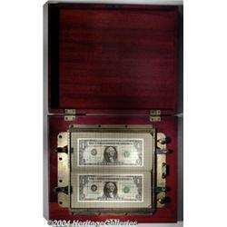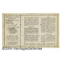 Porter Counterfeit Detector. This is the equal of the finest example of this rare counterfeit detector that we have seen. The wood case is flawless but for a few minor surface scratches, the glass is perfect and original, and every knob, screw and moving slide is original and without damage or wear. This detector operated on the basis of placing a genuine note on one sliding panel and a suspected counterfeit on the other, and then by manipulating the panels, the notes could be drawn into line on the alphanumeric graph, and the position of various elements could be compared. In short, it was pretty much useless. But what a fancy package. Included with this detector is the original instruction booklet. Over the years, we've seen eight of these detectors, only one other of which is as well preserved as this beautiful piece. The original glass is etched with the graph lines. Most Porters have had their glass broken and replaced at some point, but not this one. This detector contains two genuine modern $1 Bills for demonstration purposes. The exact date on which these were manufactured is a matter of conjecture, but materials and craftsmanship seem to indicate late '20s or early '30s. The instruction sheet with this detector has an overprint export-agent name and address, which indicates that these were still being sold in the 1940's, as the agent's San Francisco address includes the two-digit postal-zone number, which came into use in May of 1943. <BR><BR><B>Important notice:</B> Heritage usually auctions material at the rate of 200-250 lots per hour. On some occasions eBay Live bid software or the Internet may not be able to keep up with the pace of the auction. We recommend placing a realistic absentee bid now as insurance to avoid disappointment. Occasionally the auctioneer may eliminate or reject an eBay Live bid, and the auctioneer may also reopen a lot after the close of the eBay live bidding (usually because we missed an audience bid), and may reject your bid even if it shows you as the winning bidder. By bidding via eBay Live, you agree that Heritage may award the lot to another bidder at its sole discretion under the circumstances described above or any other reasonable circumstances. Since eBay bids are not shown to us until we open the lot on the floor, we treat those bids just like floor bids. In most cases the floor responds before the eBay bid is presented to us, due to Internet lag time, so for consistency we have made it a policy that floor bids are always considered first over tie eBay live bids. Also please note that all Heritage lots purchased through eBay Live carry a 20% Buyer's Premium. Please make sure you read the Terms and Conditions before you bid. <BR><BR><B>IMPORTANT ANNOUNCEMENT ABOUT RESERVES:</B> Heritage now divulges all reserves on its web site 7 days before every auction. If you want to know whether the reserve on this lot has been met, and if not, what the reserve amount is, please visit this lot page on the HeritageCoin.com web site, or email: bid@HeritageGalleries.com