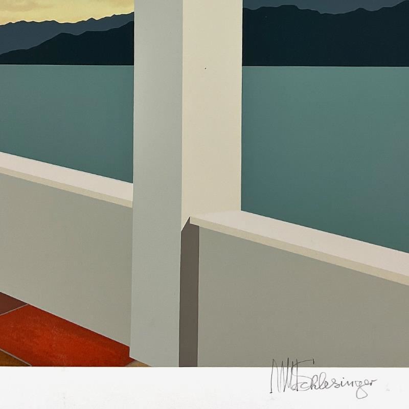 "Portico" is a limited edition serigraph on paper by William Schlesinger (1915-2011), numbered 1/215 and hand signed by the artist. Includes Letter of Authenticity. Measures approx. 27.5" x 24.5" (border), 21.5" x 18" (image). There are minor smudges in the white border area.