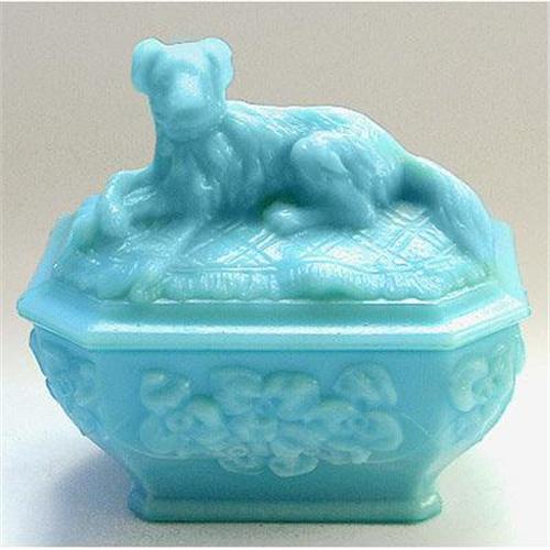 <tr><td>Title:Portieux Blue Milk Glass DOG ON RUG Powder Jar</td></tr>