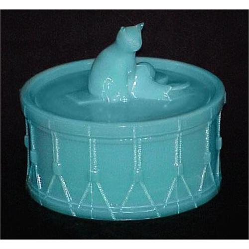 <tr><td>Title:Portieux Cat & Drum Blue Milk Glass Powder Jar</td></tr>