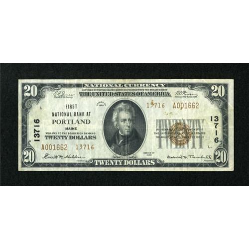 <B>Portland, ME</B></I> - $20 1929 Ty. 2 <B>First NB</B></I> Ch. # 13716<BR> Type Twos only from the last of eleven national banks to issue notes in this community. This nicely margined <B>Very Fine</B></I> is one of about two dozen examples reported. A few minor spots on the face are noted.<BR><BR><b>Shipping:</b> Coins & Currency (<a target="_blank" href="http://www.heritageauctions.com/common/shipping.php">view shipping information</a>)