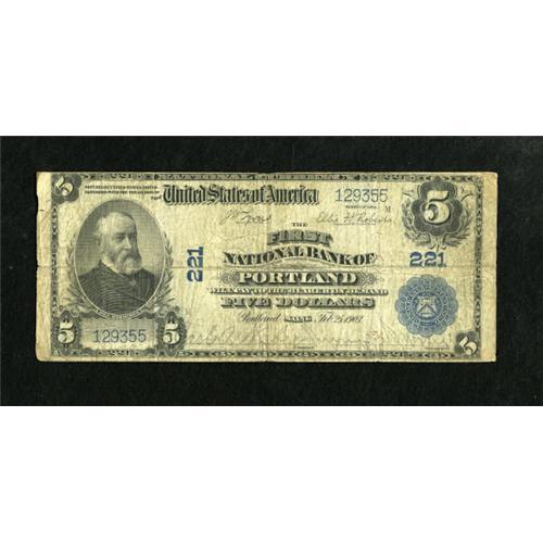 <B>Portland, ME</B></I> - $5 1902 Plain Back Fr. 598 <B>The First NB</B></I> Ch. # 221<BR> Signatures remain on this $5 from a bank that was brought to its knees by the Great Depression. <B>Very Good</B></I>.<BR><BR><b>Shipping:</b> Coins & Currency (<a target="_blank" href="http://www.heritageauctions.com/common/shipping.php">view shipping information</a>)