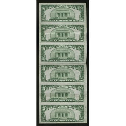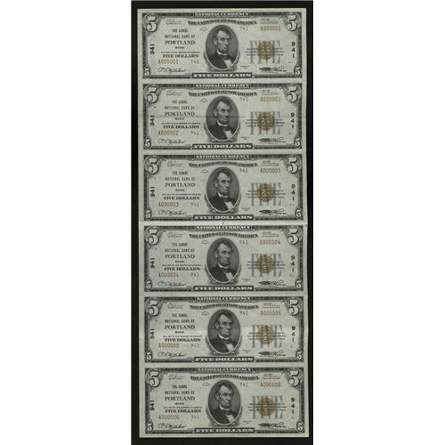 <B>Portland, ME</B></I> - $5 1929 Ty. 2 <B>The Canal NB</B></I> Ch. # 941 Uncut Sheet<BR>This serial number 1-6 embossed uncut sheet shows folding between the second and third, third and fourth, and fourth and fifth notes. There are lateral center folds on the second and fifth notes, too. The cashier on this Type 2 sheet is P.J. Milliken. <B>About Uncirculated.</B></I><BR><BR><b>Shipping:</b> Coin/Currency (<a target="_blank" href="http://www.heritageauctions.com/common/shipping.php">view shipping information</a>)