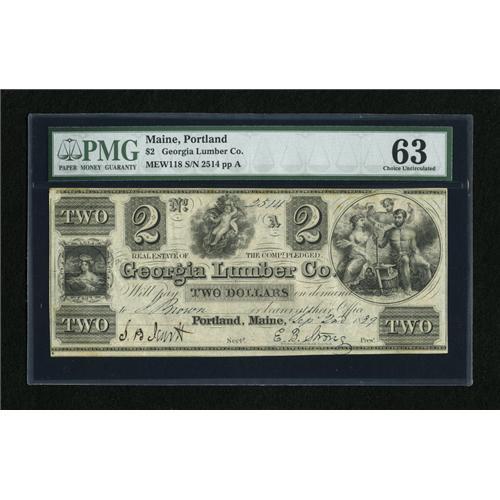 <B>Portland, ME- Bank of Georgia Lumber Co.</B></I> $2 Sept. 2, 1839<BR>This exquisite issue boasts bright, remaining signatures, date, and serial number. <B>PMG Choice Uncirculated 63.</B></I> <BR><BR><b>Shipping:</b> Coins & Currency (<a target="_blank" href="http://www.heritageauctions.com/common/shipping.php">view shipping information</a>)