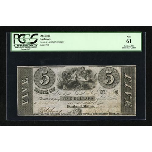 <B>Portland, ME- Bank of Georgia Lumber Co</B></I>. $5 Dec. 4, 1845<BR> This is a nicely preserved <B>PCGS New 61 </B></I>example<B>.</B></I><BR><BR><b>Shipping:</b> Coins & Currency (<a target="_blank" href="http://www.heritageauctions.com/common/shipping.php">view shipping information</a>)