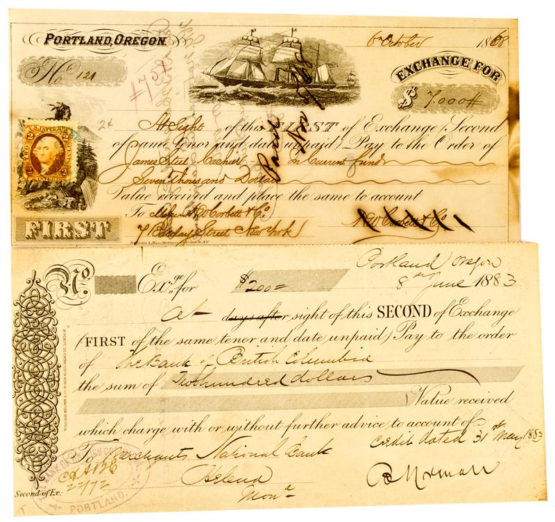 Lot of 2. 1) No. 121 first of exchange issued Oct. 6, 1868 for $7000. One brown 2 cent seal cancelled revenue stamp at left. Vignette of ship at center. Stamp covers most of vignette of Indian looking from hillside at left. Endorsed on reverse. 2) Second of exchange issued June 8, 1883 "Bank of British Columbia. Endorsed on reverse. 8.5" x 4.25". Fine