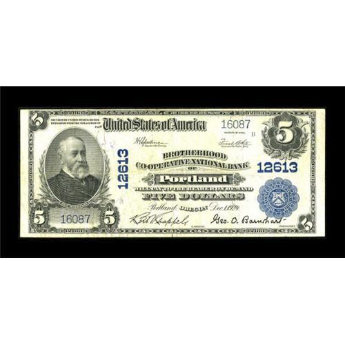 <B>Portland, OR</B></I> - $5 1902 Plain Back Fr. 609 <B>Brotherhood Co-operative NB</B></I> Ch. # 12613<BR> A nice large example from this labor union affiliated bank. Geo. O. Barnhart, who signs as President, was an organizer of these banks and also served as president of the Brotherhood Co-Operative NB of Spokane, Washington as well. <B>Fine-Very Fine</B></I>.<BR><I>From The Kansas City Collection.</B></I><BR><BR><b>Shipping:</b> Coins & Currency (<a target="_blank" href="http://www.heritageauctions.com/common/shipping.php">view shipping information</a>)