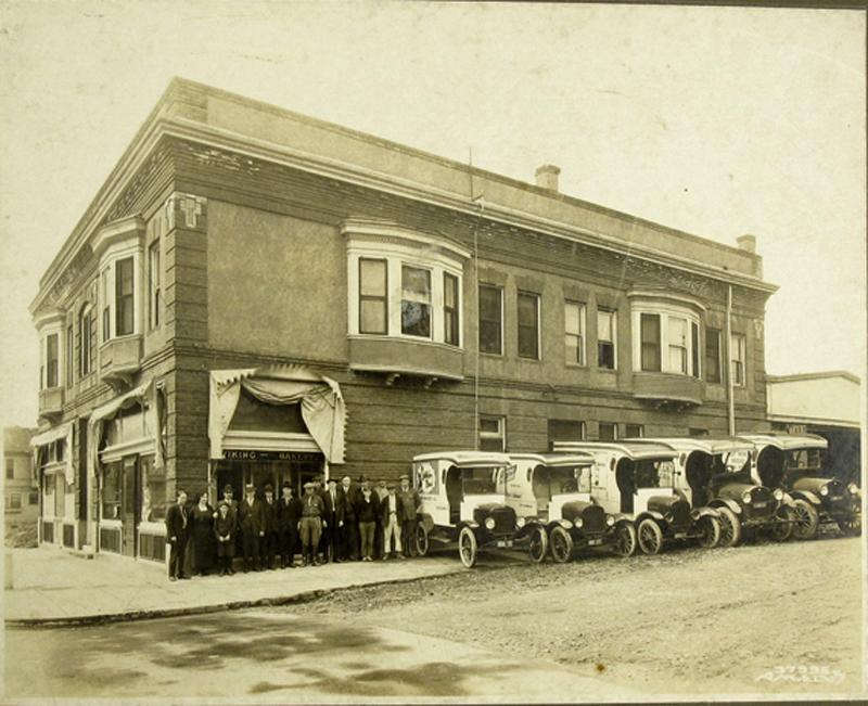 Photograph measures 9 ½”x 7 ¾,” black single matte with raised dark black border 13 ½”x 11 ½,” high contrast—minor fading in the upper portion of photo, and the focus is sharp. Viking Bakery reads clearly above the front door and on the autos. Minor wear on the corners of the matte. There are a few abrasions on the image. Photographer identified as Angelus. Mautz says the photographer was active in Portland 1911-17and aka Angelus Commercial Photographic Company. In this photo people pose in front of the Bakery. A fine display of the company autos are lined up along the street. The Viking Bakery Co. was located at 505 E. Stark. No. 37995.