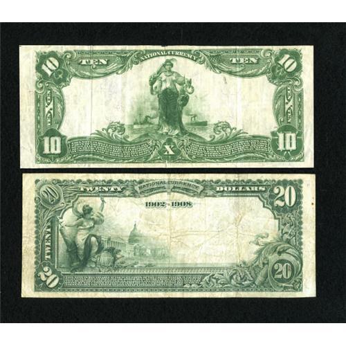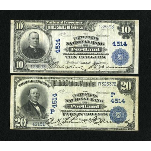 <B>Portland, OR</B></I> - A circulated pair from this bank bearing a forbidden title:<BR> $10 1902 Plain Back Fr. 627 <B>The United States NB</B></I> Ch. # 4514 <B>Very Fine,<BR></B></I>and a $20 1902 Date Back Fr. 645 <B>The United States NB </B></I>Ch. # (P)4514 <B>Fine.</B></I><BR><BR><b>Shipping:</b> Coins & Currency (<a target="_blank" href="http://www.heritageauctions.com/common/shipping.php">view shipping information</a>)