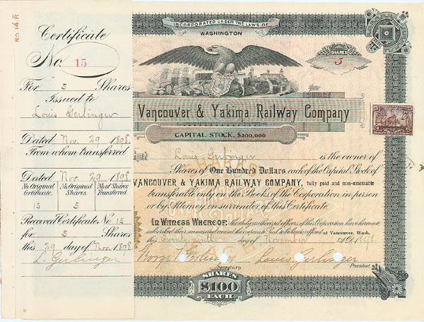 1898, Washington. Stock certificate for 5 shares. Orange/Black. Vignette of a spread eagle with a shipping scene in background at top center. Issuedto Louis Gerlinger and signed by him three times. Once on verso, as President and again on the stub. Louis Gerlinger, Sr. (1853 - 1948) a businessman in the railroad and timber industries in Oregon in the early 20th century. In 1896, Gerlinger organized and built the Portland, Vancouver and Yakima Railroad on behalf of the Harrimans. Two of Gerlinger's sons, George T. Gerlinger and Louis Gerlinger, Jr., managed the railway. In 1906, Gerlinger purchased the Cone Lumber Company, and renamed it Willamette Valley Lumber Company (WVLC). The WVLC would become Willamette Industries in 1967 and part of Weyerhaeuser in 2002. Signed by George T. Gerlinger as Secretary of the Railway. George T. Gerlinger, eldest son of Louis Gerlinger; Entrepreneur, influential in the railroad and lumber products business. Litho. Punch cancelled at officers' signatures. Excellent.