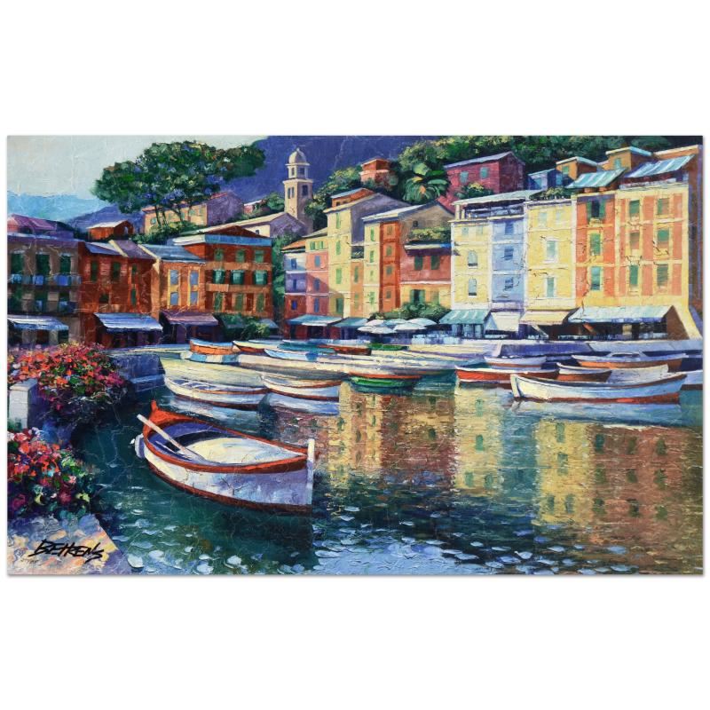 "Portofino Harbor" is a limited edition hand embellished giclee on canvas with a crackled vecchia finish by Howard Behrens (1933-2014), numbered and hand signed by the artist. Includes Certificate of Authenticity! Measures approx. 27" x 17" (image).