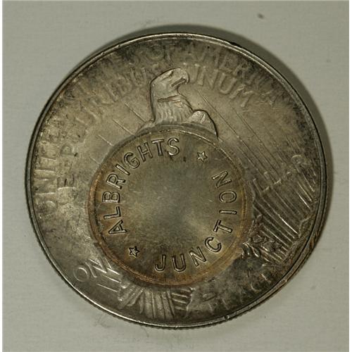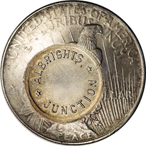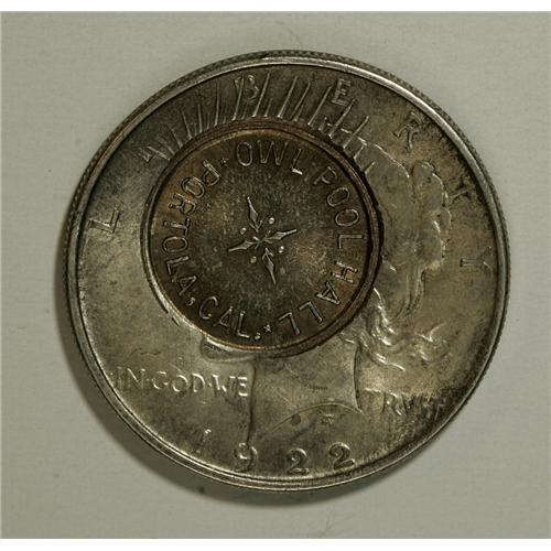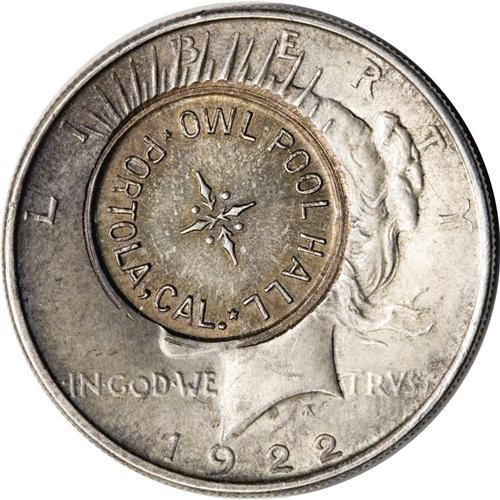 <B>Portola, California, Owl Pool Hall, Counterstamped Peace Dollar.</B></I> A neat counterstamped 1922 Peace dollar. Portola, California, is in Plumas County in the high Sierra Mountains, and this merchant has issued a token good for 50 cents in trade, as listed on page 376 of the California token catalog by Kappen. The market value of this item is approximately $150-$200. In addition to the Owl Pool Hall counterstamp, the reverse is counterstamped Albrights Junction.<BR><BR><b>Shipping:</b> Coins & Currency (<a target="_blank" href="http://www.heritageauctions.com/common/shipping.php">view shipping information</a>)