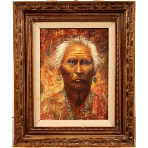 Title: Unknown, Indian Portrait<p>Artist: Hal Kettle<p>Circa: Contemporary<p>Medium: Oil on Massonite Board.<p>Art Size: 12" x 16"<p>Frame: . 20" x 24", Wood frame with fabric lining.<p>Condition: Artwork is in very good condition. Frame will show light surface marks.<p>Signature: Signed by artist lower right corner, in oil.<p>Notes: Another magnificent portrait of an American Native Indian in low key background setting. Fantastic expression in indian's face with weathered skin and intense look.<p>