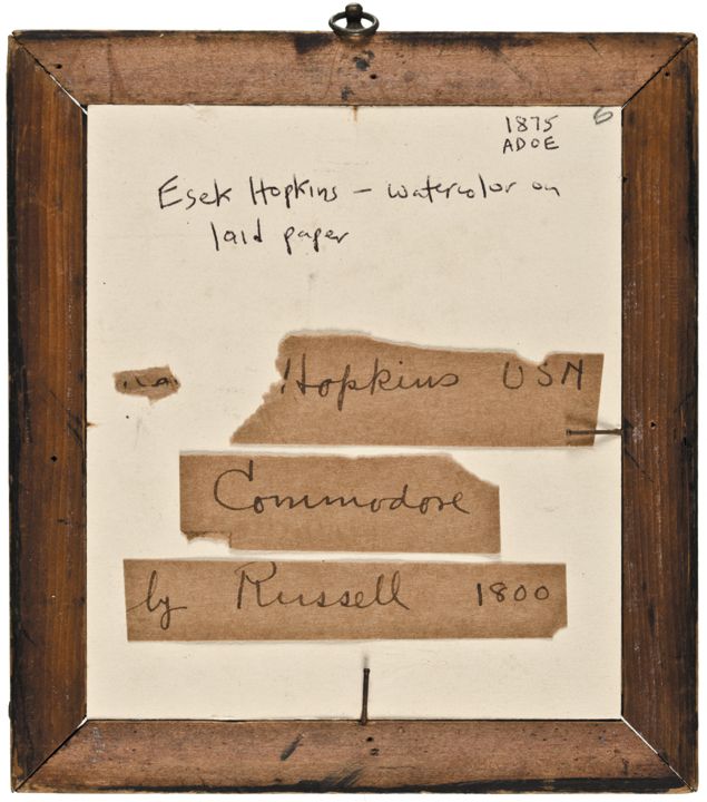 An original, Hand-Colored Gouache upon 18th Century, period laid paper, being a Portrait of Robert i.e. Esek Hopkins (1718 - 1802), measuring about 5.75” x 5” and framed to 7.25” x 6.5”. Chest-up pose of Hopkins in uniform on laid paper by Russell. Obviously with significant age, there is a small attached extra portion on the paper folded behind the image. Someone has written “Robert Hopkins American Commodore” in small print in pencil on the reverse of the attached paper. Colors are bold and rich. Commodore Esek Hopkins was the first and only Commander-in-Chief of the Continental Navy Fleet during the American Revolutionary War, and was a Founding Member, together with George Washington, of the Society of the Cincinnati.