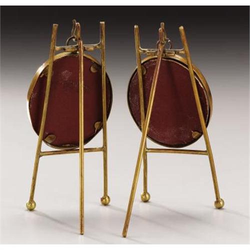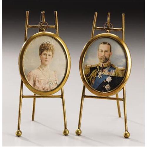 <B>Pair of Portrait Miniatures of George V and Queen Mary</B></I><BR><I>Circa 1915</B></I><BR><BR>Printed on paper, the monarch wearing full court uniform, the Queen with a diamond tiara, multiple strands of pearls and a pink gown, each within an oval brass frame, with individual miniature brass easels-miniature-2 ½ in. long; easel-5 ¼ in. long <BR><BR><b>Shipping:</b> Requires 3rd Party Shipping (<a target="_blank" href="http://www.heritageauctions.com/common/shipping.php">view shipping information</a>)