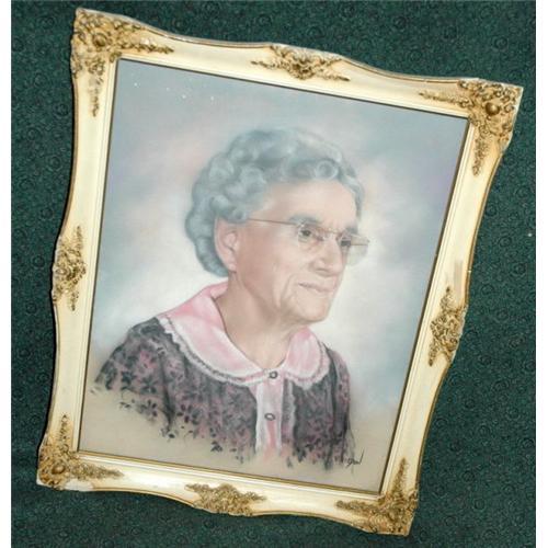 Large Portrait Painting of a Lovely Older Lady, Lucy Anna Melton. It is a well done professional pastel painting. It comes behind glass in an ornate wood and plaster frame. The back is marked with her name: Lucy Anna Melton "McGee", died Sept 17, 1970. Then it has a piece of tape that claims the painting as the property of Ethel Short. I don?t know either of these ladies. <p> It is signed however I cannot make out the signature to quote the name with certainty. The frame is 23 1/2" x 19". <p> The condition of the painting is excellent. The bottom left corner of the frame is damaged. It is repairable but I don't have the expertise to fix.