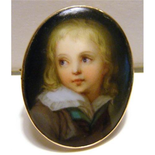 More pictures are available. A lady's porcelain brooch on a 14k karat yellow gold bezel. The brooch features a hand painted portrait of a young gentleman, blonde haired with a white shirt and a grey jacket against a dark background. The artistry in the portrait is very good. The porcelain measures 43.00mm x 34.5mm. The portrait is mounted in a bezel frame with a fold over clasp. The frame is marked "RAH" and "14K" The total weight is 12.0 grams. This item comes with a retail replacement estimate appraisal from a certified jewlry appraiser of $800.