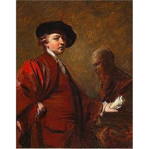No false modesty there, then - and no nonsense either about psychological insight or self-revelation. Reynolds shows himself exactly as he wished the world to see him, a pillar of the establishment dressed in the velvet cap and crimson robes he had worn when Oxford University conferred on him an honorary degree in 1773. He then indicates his professional status by the presence of a bust of Michelangelo at his side, and, more subtly, by constructing a composition that recalls Rembrandt's famous Aristotle Contemplating a Bust of Homer.