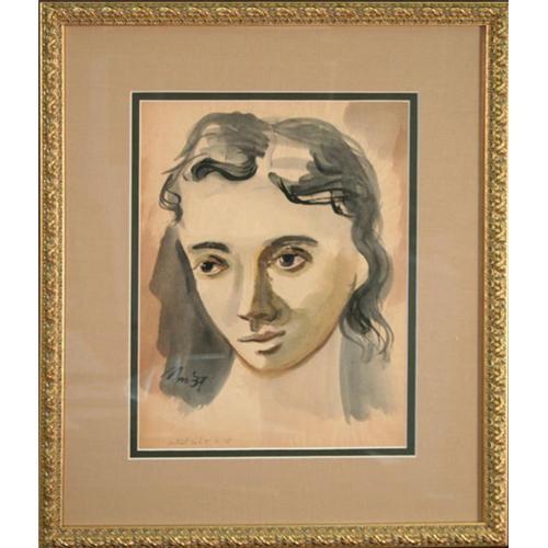 ?Portrait of Woman? is one of Cohn?s original watercolors and is a portrait painting that invites the viewers to form their own interpretations. Cohn employed the wet-on-wet technique to create this large amorphous composition. To work wet-on-wet the artist saturates the paper with water and applies the pigment to the wet surface allowing it to bleed into all other wet areas freely, mixing colors and creating interesting textures as in ?Portrait of Woman.? The areas of gray, blue, and black bleed into the areas of burgundy, creating multiple shades of violet. There are also areas of brown to compliment the colder tones in the piece. This wonderfully fluid composition is complimented perfectly by the prato green vellum lower mat and titian gold linen top mat that it is mounted beneath. The painting is capped off by the beautiful ornate gold frame, giving it a sophisticated and modern presentation and bringing the total measurements to 19.25?x 22.25?. It is truly a marvelous, affordably priced piece by a nationally renowned artist that would be a unique and eye-catching addition to any collection of fine art.