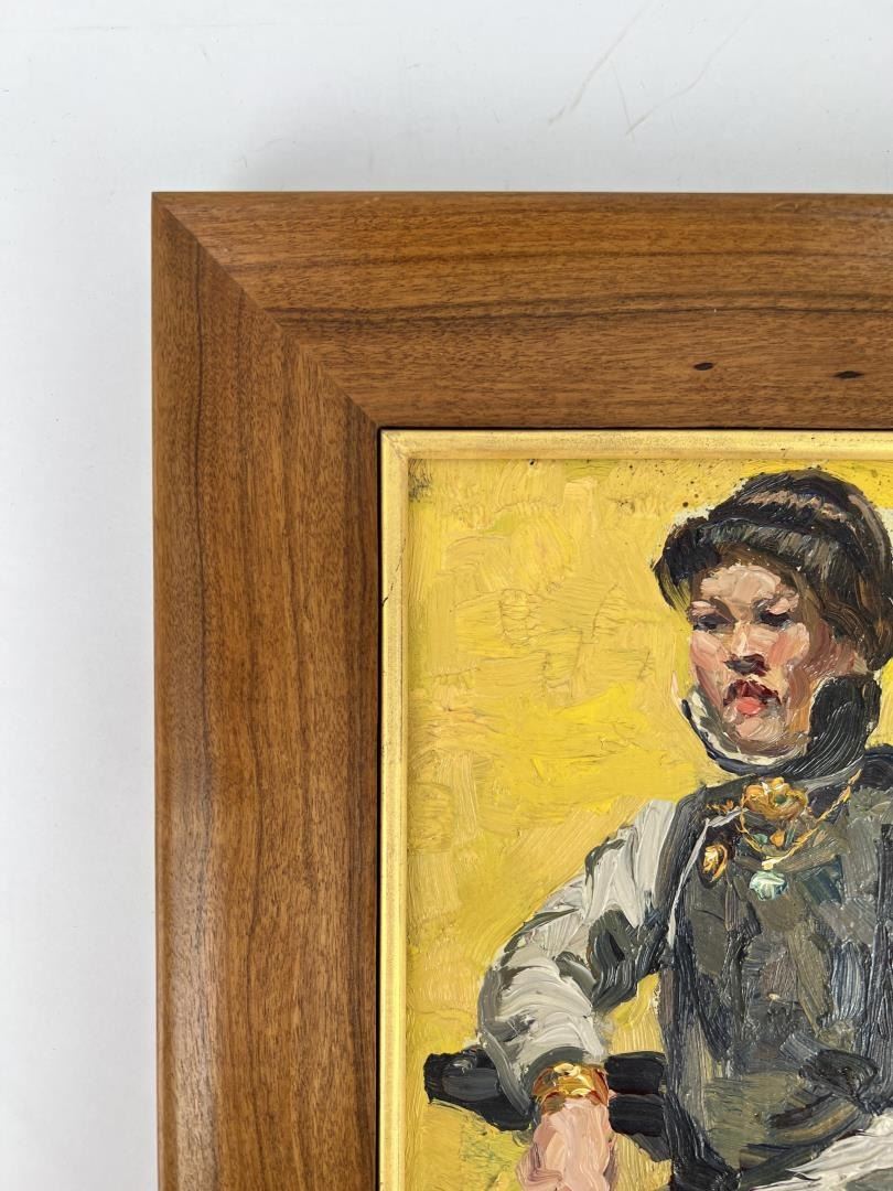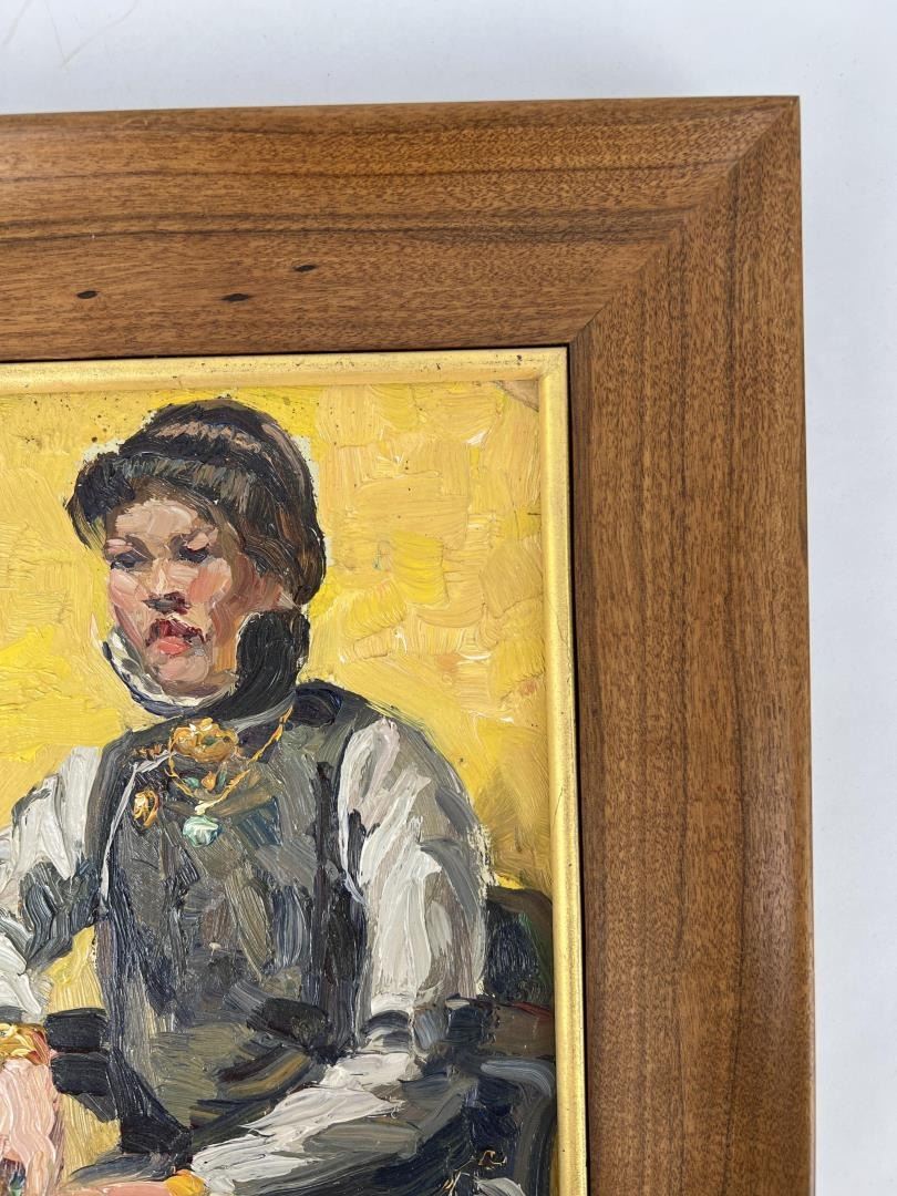 10" by 12" framed. Wonderful image of a well to do Chinese Woman. Probably painted in San Francisco in the 1920s. Also included with this lot is Frederick Kress's original Sterling Silver California School of Design Award Medal. Born in Pittsburgh, PA on Jan. 7, 1888, the son of artist Carl Victor Kress. Fred Kress spent his childhood in Pittsburgh and high school years in Independence, MO. His arrival with his family in San Francisco was a few months before the disaster of 1906. While working with his father as a sign and scenery painter, he studied at the Institute of Art. During his five years at that school he also studied privately with local artists Maynard Dixon, C. Chapel Judson, and Emil Grebs. In 1912 Kress began making painting excursions into the Big Sur area, Yosemite, Lake Tahoe, and Marin County when not working in the paint department of Foster & Kleiser (billboards), a position he held for 42 years. He exhibited with the San Francisco Art Ass'n until 1920 and after that time painted strictly for pleasure and was not known to have exhibited or sold any of his paintings. A resident of San Francisco until 1962, his last years were spent in Santa Rosa, CA where he died on Aug. 10, 1970. Using a bright palette, he painted small, realistic landscapes of northern California. Exh: San Francisco Art Association, 1913-16.